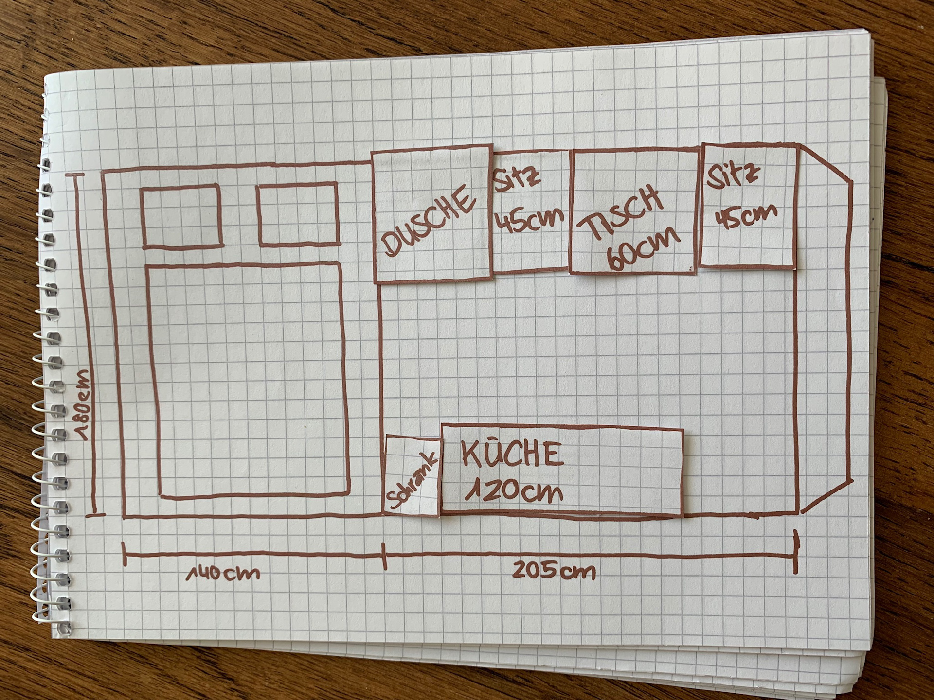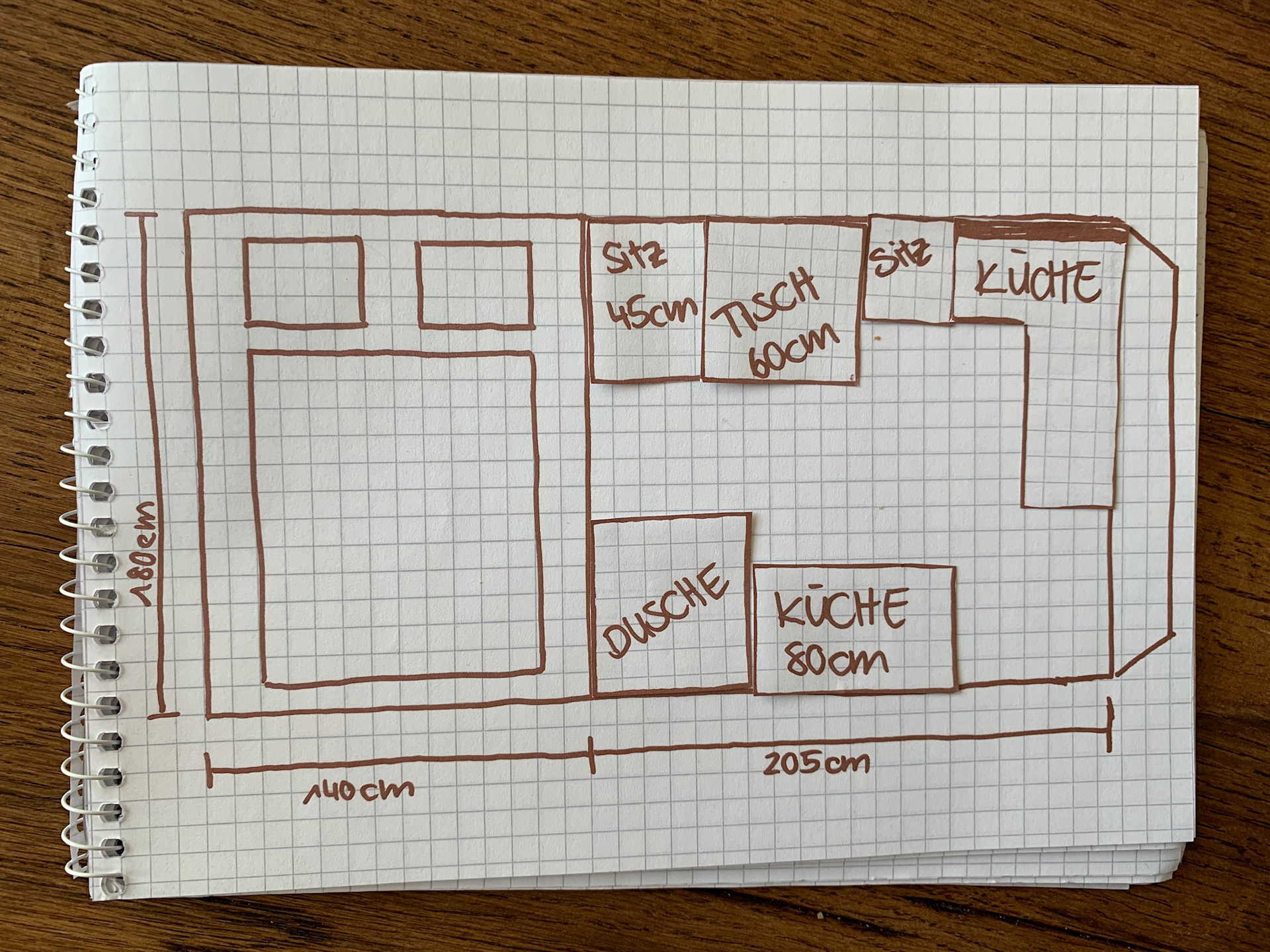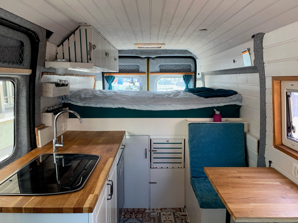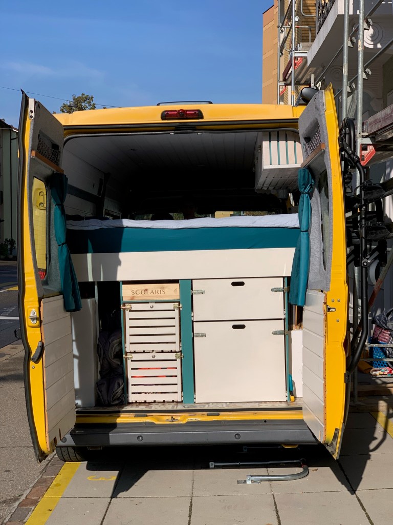 Wir haben das geplante Layout fast wie geplant umgesetzt. Auf die Dusche haben wir schlussendlich verzichtet und uns für eine Aussendusche entschieden. Grund dafür war, dass wir beim Ausbau gemerkt haben, dass wir lieber etwas mehr Platz und Luft möchten.