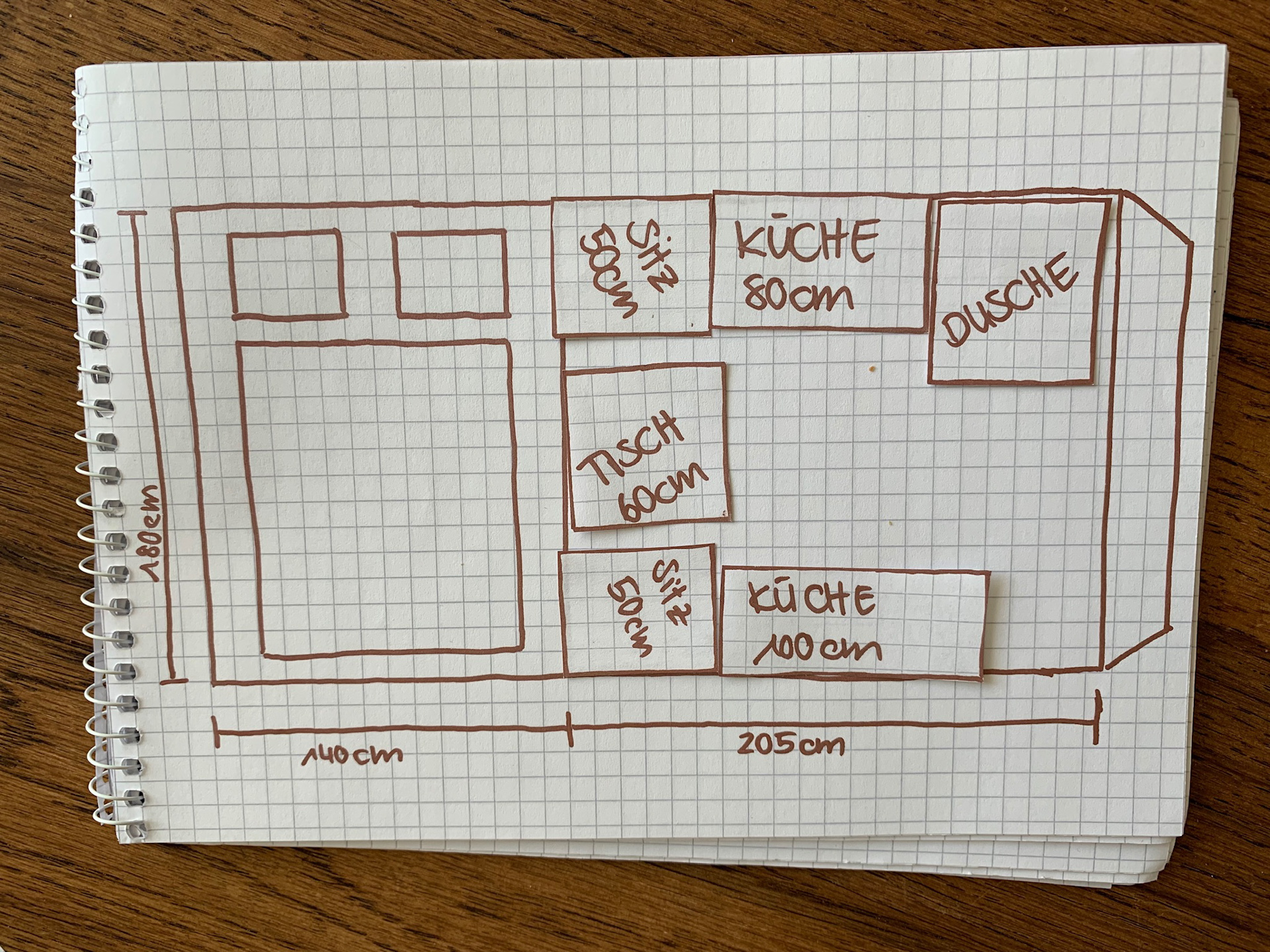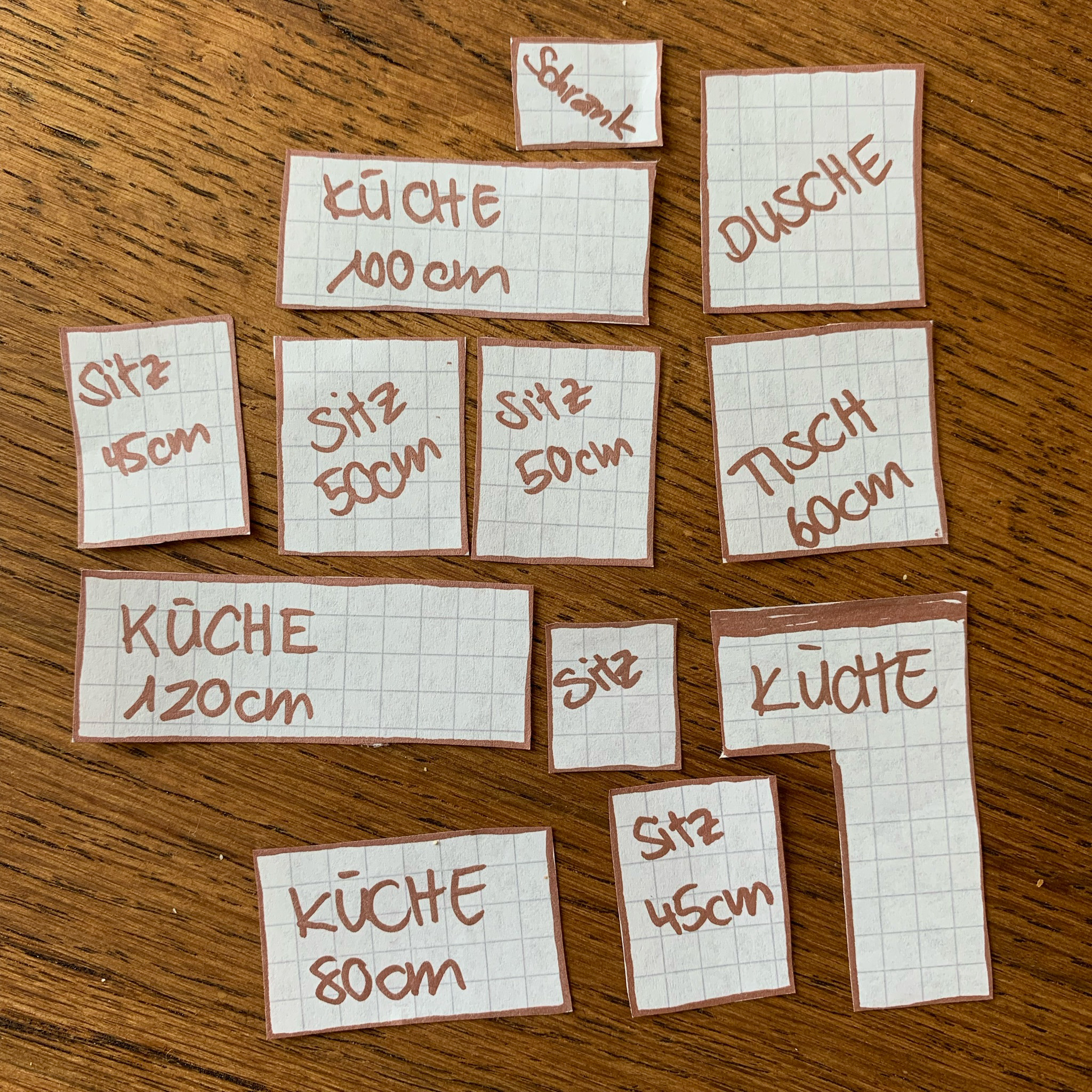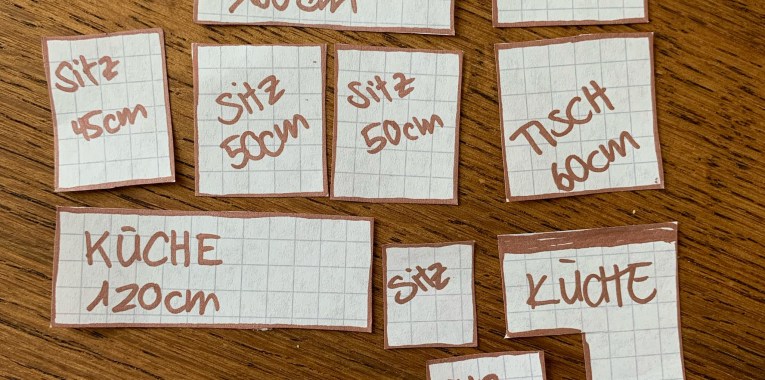 Zur Planung haben wir den Bus in einem kleineren Massstab nachgezeichnet und alle Elemente die wir verbauen wollten quasi als Puzzle-Teile zugeschnitten. Das hat uns ermöglicht, die verschiedenen Layouts einfach zu visualisieren.