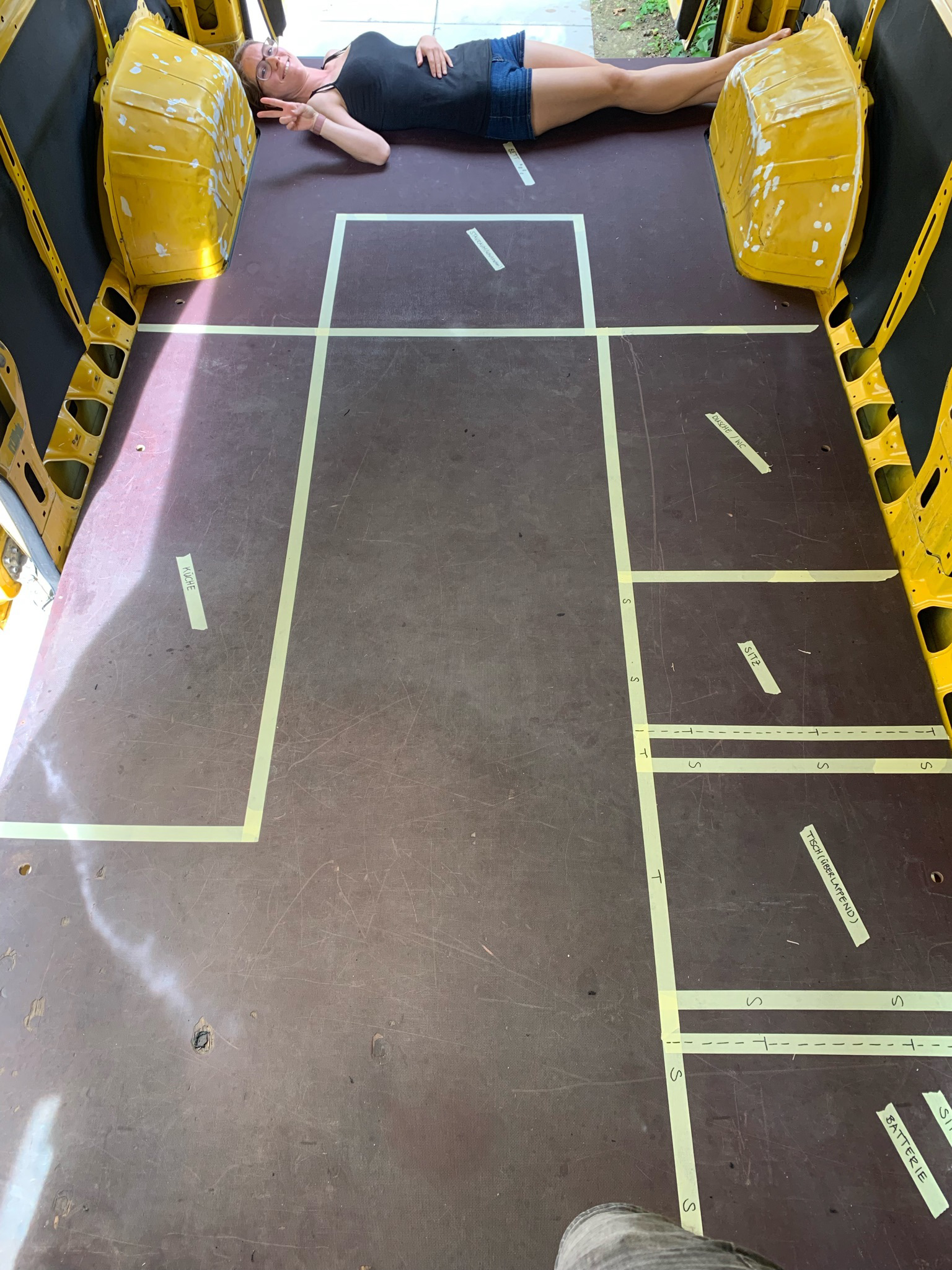 Nach der Entscheidung für unser Wunschlayout haben wir dieses dann im Bus mit Klebeband markiert, um zu prüfen, ob dieses wirklich realistisch ist.
