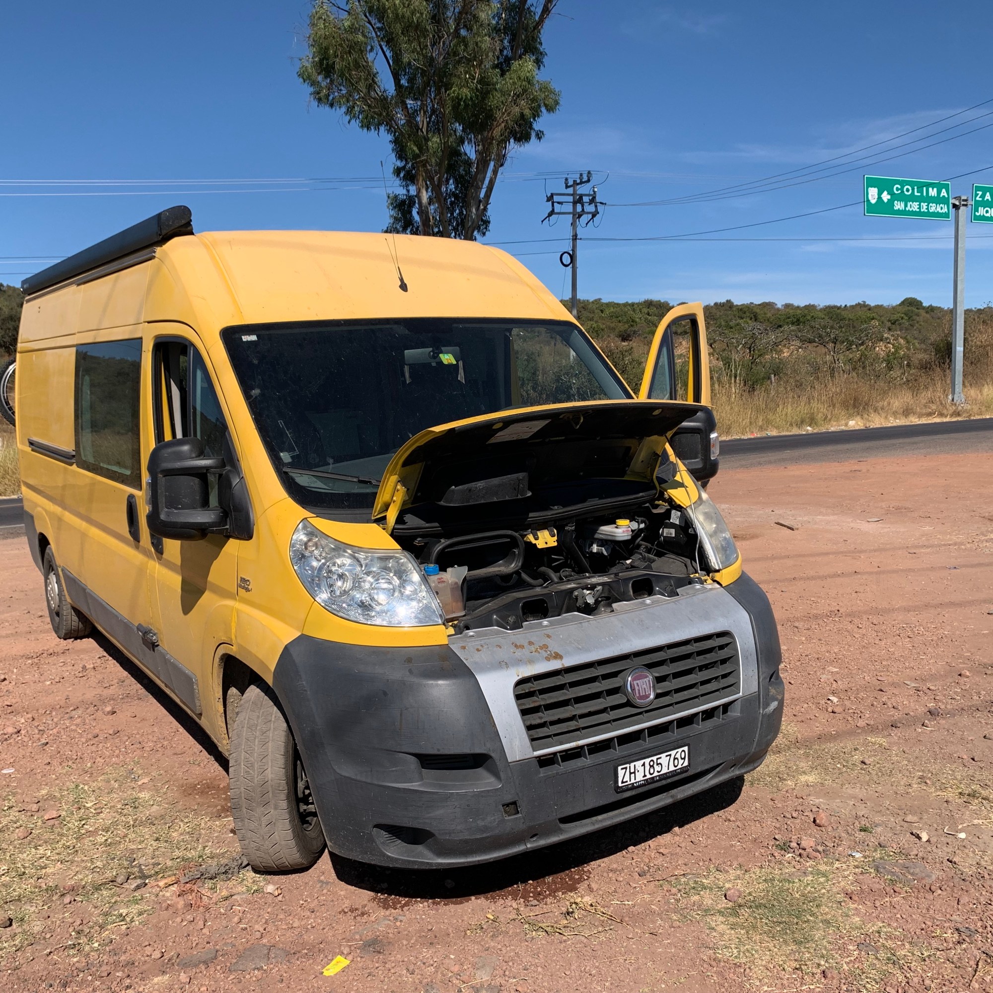 Da Morelia in einer Tagesetappe nicht zu erreichen war, planten wir eine Nacht auf einem Camping in der Mitte ein. Die Übernachtung dort nutzten wir, um unsere neuen Mountainbikes einzuweihen und wieder einmal Wäsche zu waschen. Leider schafften wir es dann am nächsten Tag nicht wirklich weit. Die mit Löchern übersäte, halb geteerte Strasse machte Beat schwer zu schaffen. Von einer Sekunde auf die andere leuchtete die Motorwarnlampe auf, begleitet von dezenten Rauchschwaden, welche aus der Motorhaube austraten. Unsere erste Panne.