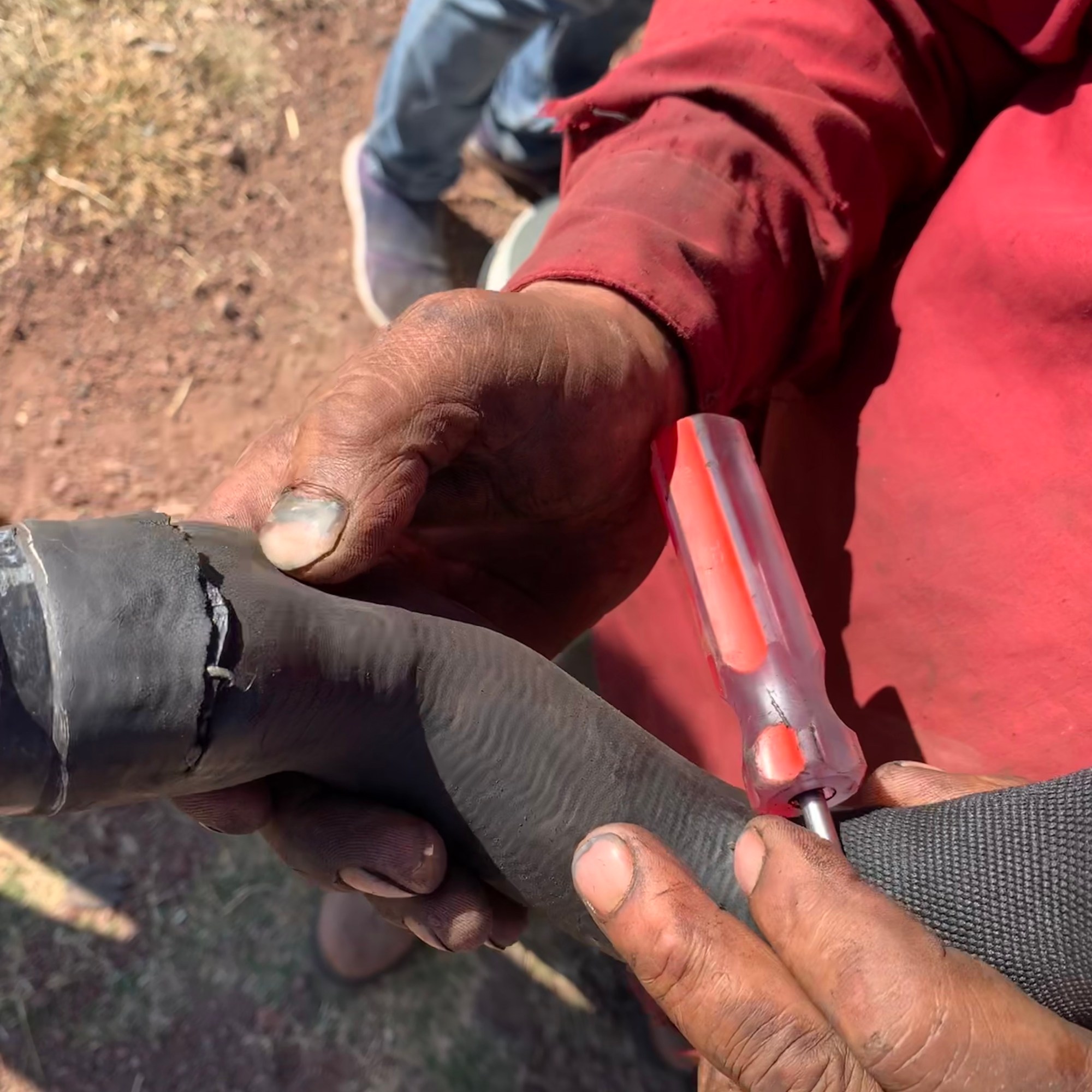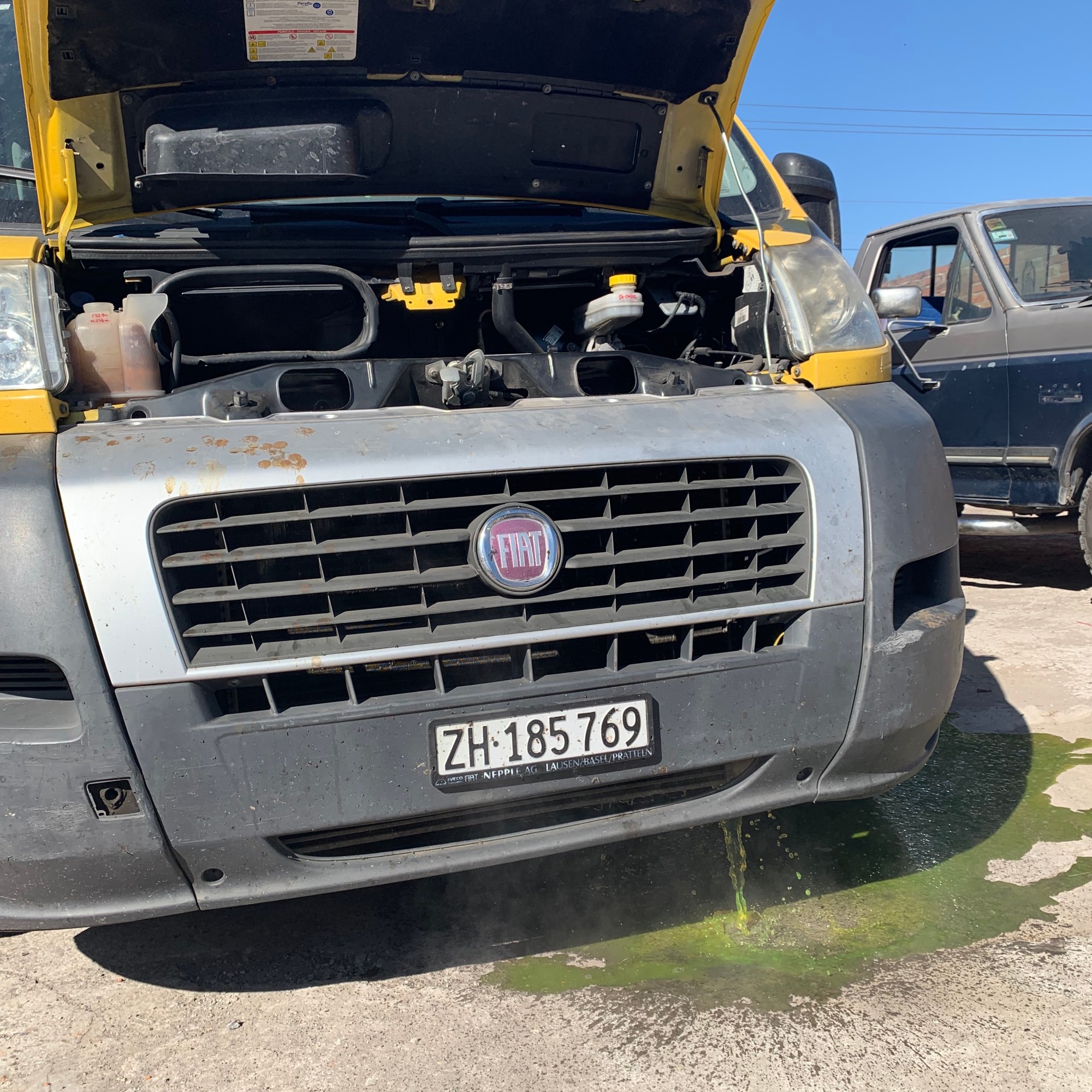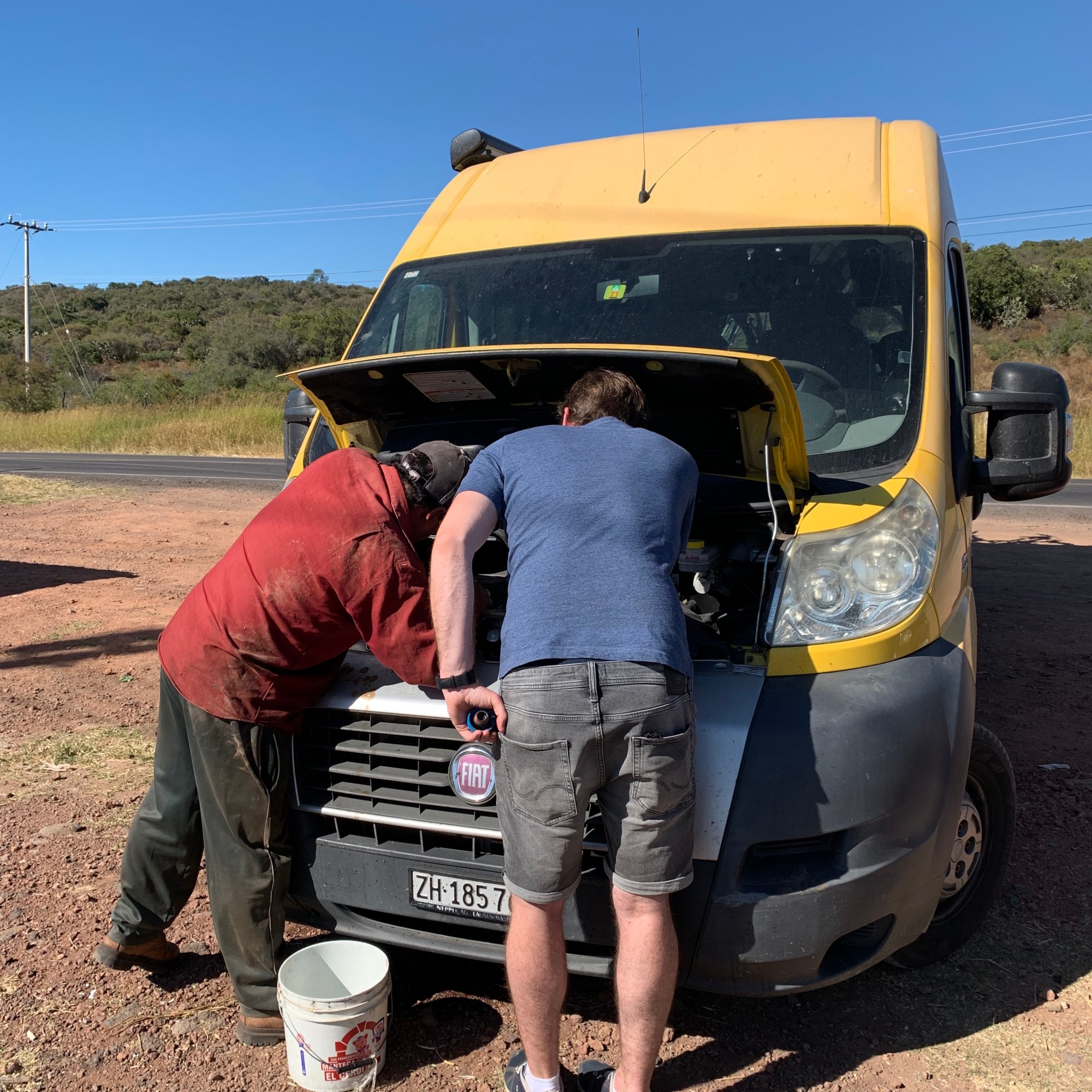 Zu unserem Glück direkt vor einem Mini-Super-Mercado mit einem netten Besitzer. Nach kurzer Begutachtung war klar, dass wir kein Kühlwasser mehr hatten. Leider half nachfüllen auch nicht, denn der Schlauch war gerissen. Der Mercado-Besitzer verständigte auf unsere Bitte hin einen Automechaniker, der direkt zu uns kam und Beat am Strassenrand notoperierte. Und das ganze für 300 Pesos (CHF 15.-). Für diesen Preis und die Hilfsbereitschaft verziehen wir ihm dann auch, dass er das falsche Kühlwasser einfüllte, welches wir später wieder ablassen mussten.