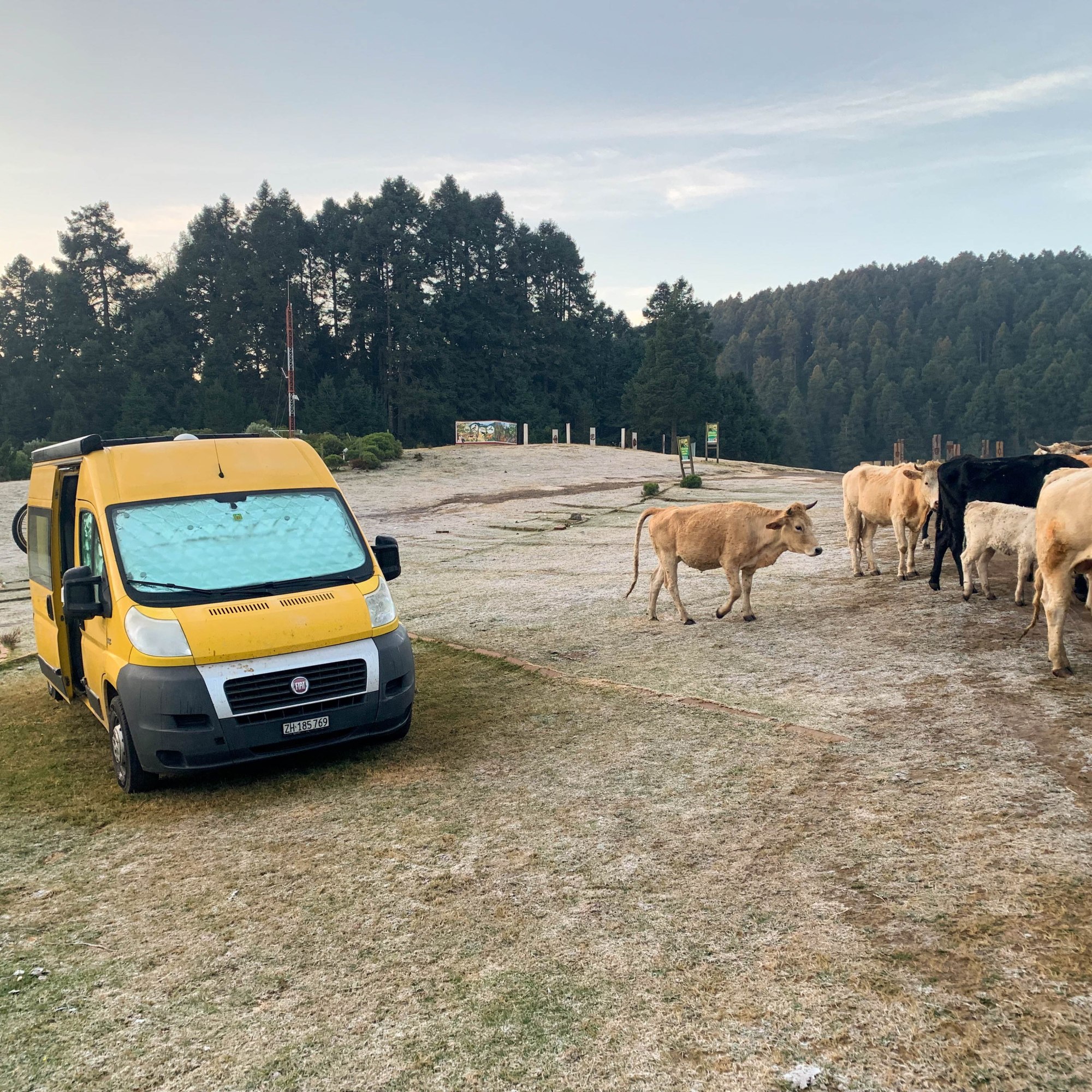 Als letzter Stop auf dieser Etappe stand das Naturreservat der Monarch Schmetterlinge auf dem Plan. Abertausende Schmetterlinge fliegen jedes Jahr in riesigen Kolonien von Kanada nach Mexiko in ihr Winterquartier. Und dort kann man sie wunderbar beobachten. Wir übernachteten direkt vor dem Eingang zum Reservat auf 3200 Metern und waren ziemlich froh um unsere Gasheizung und den wärmenden Älpler-Onepot. In der Nacht fiel das Thermometer auf unter 0 Grad und die Wiese rund um Beat war am nächsten Morgen mit Bodenfrost gezuckert.