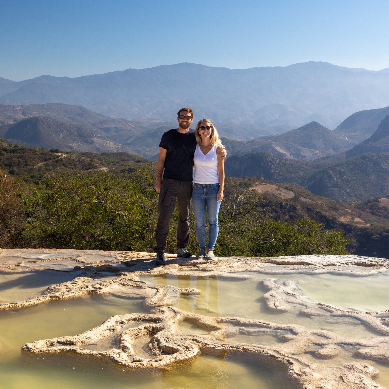 An unserem letzten Tag vor Abreise machten wir einen Tagesausflug zum «Hierve el Agua». In den Bergen von Oaxaca haben sich beindruckende Kalkbecken sowie ein versteinerter Wasserfall gebildet. Grund dafür ist das stark mineralhaltige Wasser. Auch hier galt es wieder, möglichst früh los, damit wir beim Eintreffen der Touren schon wieder weg sind. Zudem mussten wir einmal mehr unseren ganzen Mut zusammennehmen. Denn die Hauptstrasse wurde vor einem Jahr gesperrt und der einzige Weg führt daher über eine 19 Kilometer lange unbefestigte Pass-Strasse. Mittlerweile haben wir uns aber zum Glück schon daran gewöhnt mit Beat schier unmögliche Strassen zu bewältigen. Trotzdem waren einige Locals recht erstaunt, als sie uns in den Bergen begegneten. 🙂