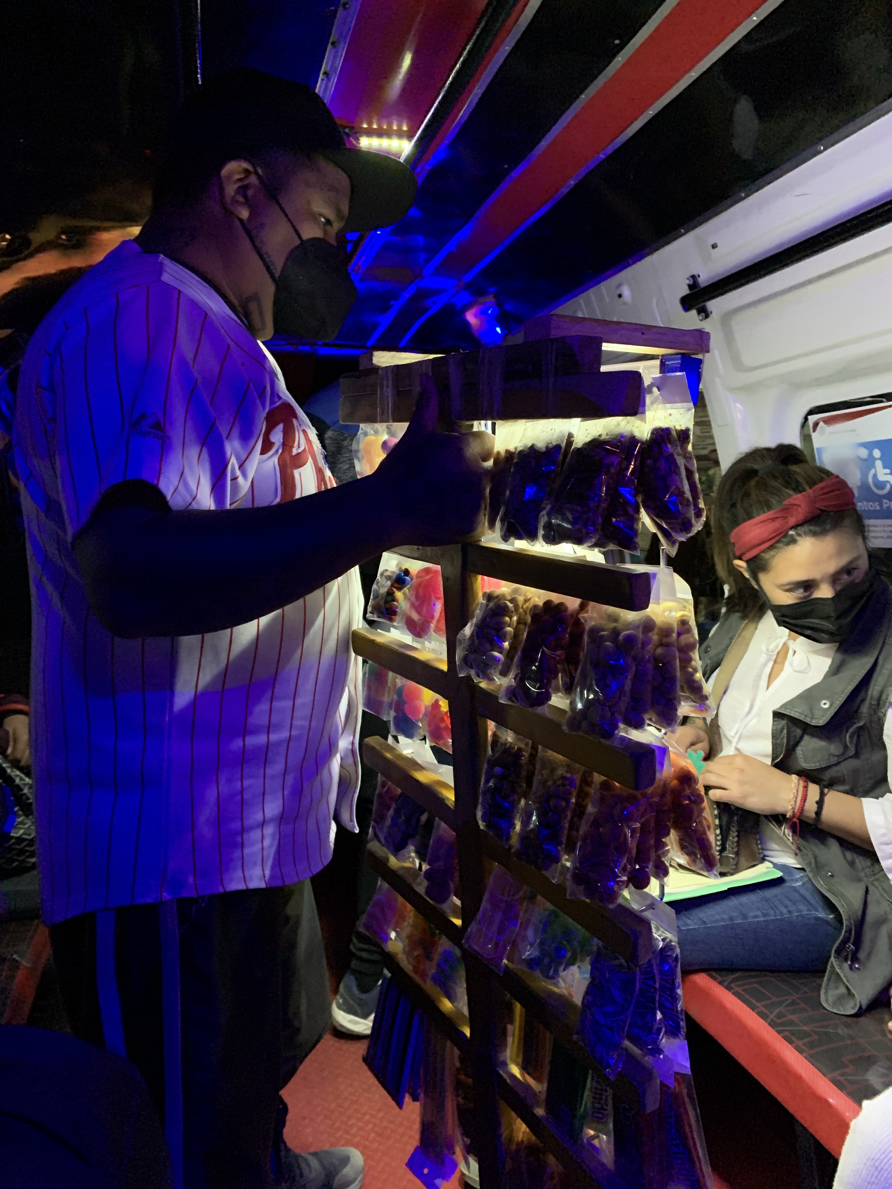 Ein Verkäufer im Collectivo-Taxi. Während der Fahrt kann man sich bequem mit Süssigkeiten eindecken.