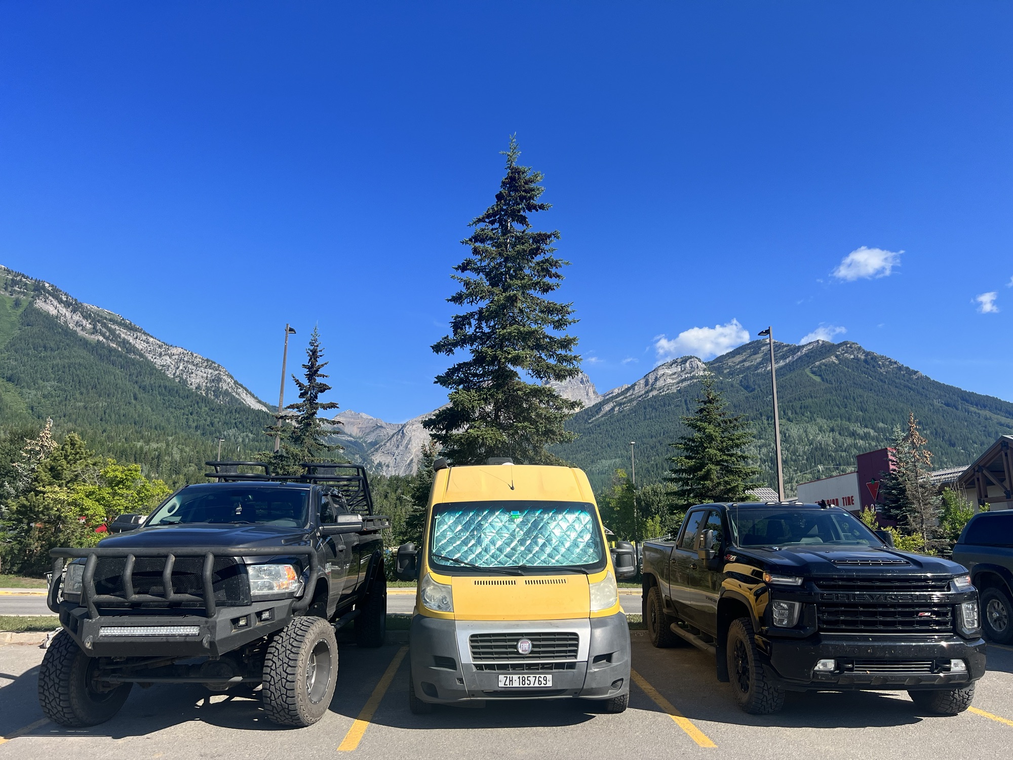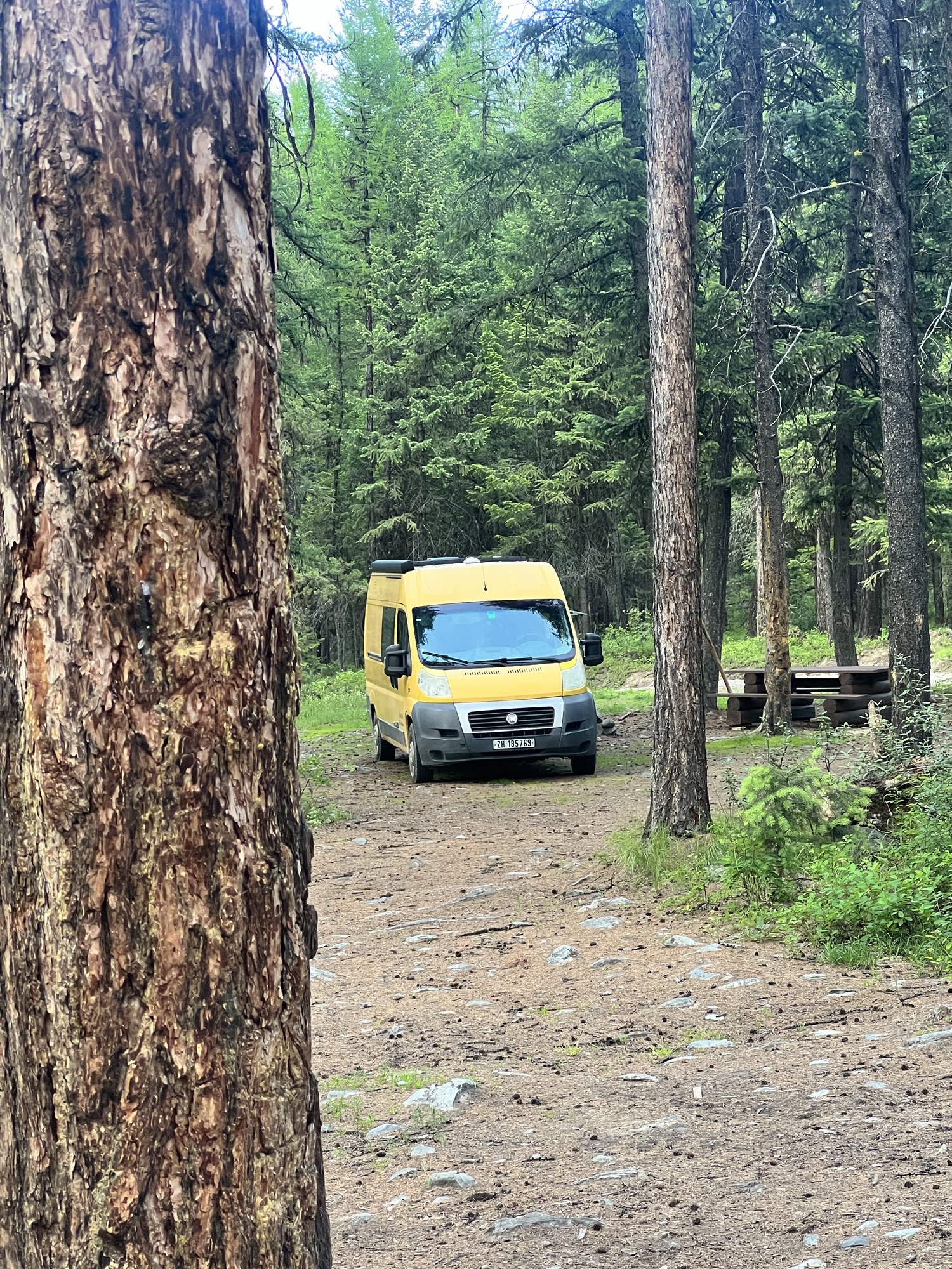 Kanada bietet unzählige schöne, wilde Übernachtungsplätze. Diese werden «Recreation Sites» genannt und befinden sich meist im Wald, an Flüssen oder Seen. Je nach Ort sind sogar Toilette und Feuerstelle vorhanden. Der Weg dahin ist oftmals herausfordernd, aber es lohnt sich fast immer. Denn nichts ist schöner, als alleine in mitten der Natur zu stehen und den Tag ausklingen zu lassen. In Fernie angekommen, übernachten wir weniger romantisch zwischen zwei überdimensionalen Trucks. Beat wirkt daneben wie ein Spielzeugauto. Am nächsten Tag wagen wir uns auf eine schwierigere Gravel-Route, auf welcher vor allem ich das Fahrrad mehr stosse als fahre. Zu gross ist der Respekt vor den grossen Steinen. Die Tour ist trotz allem schön, am Abend sind wir aber ziemlich geschafft.