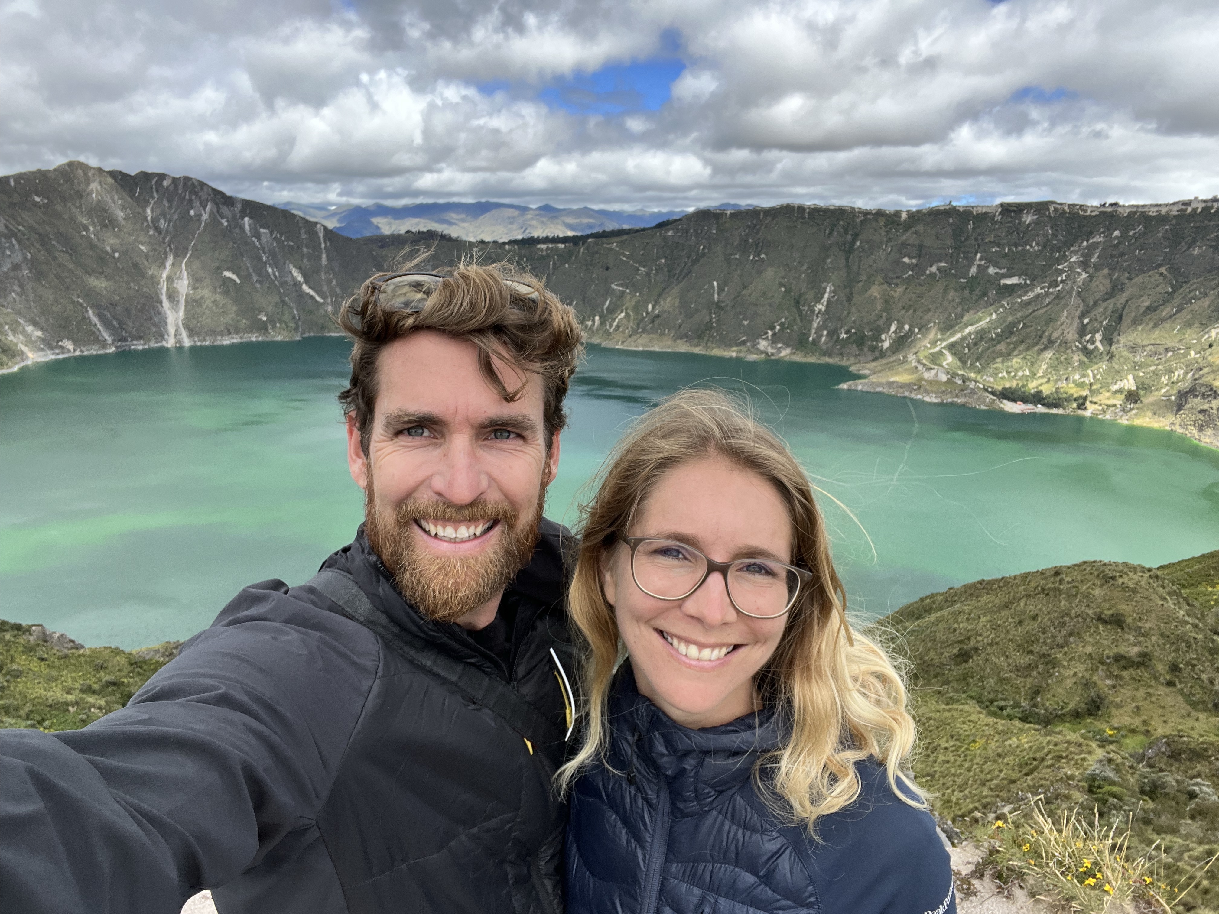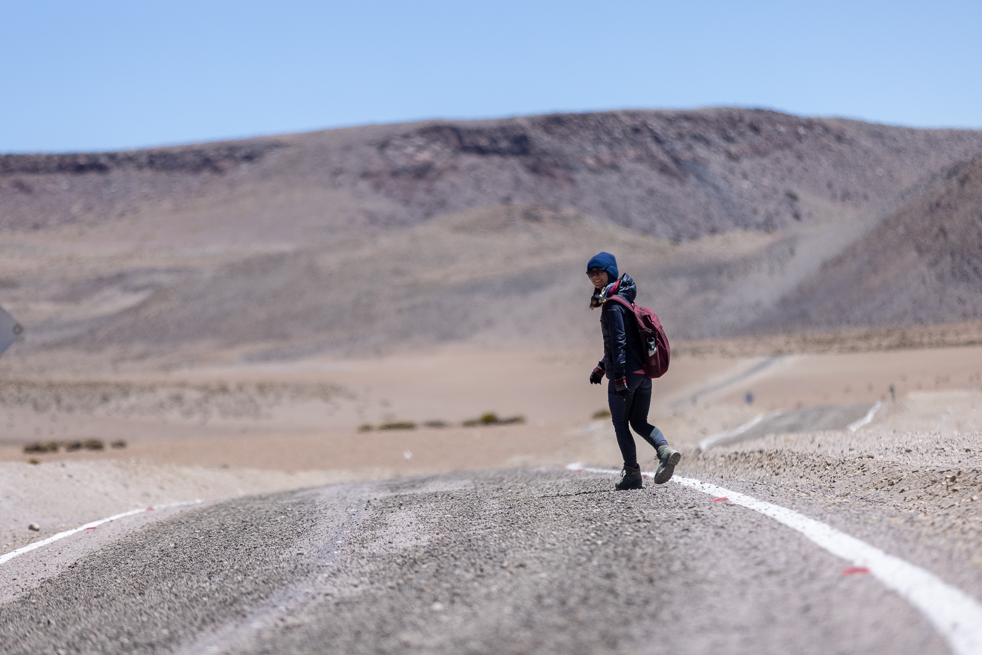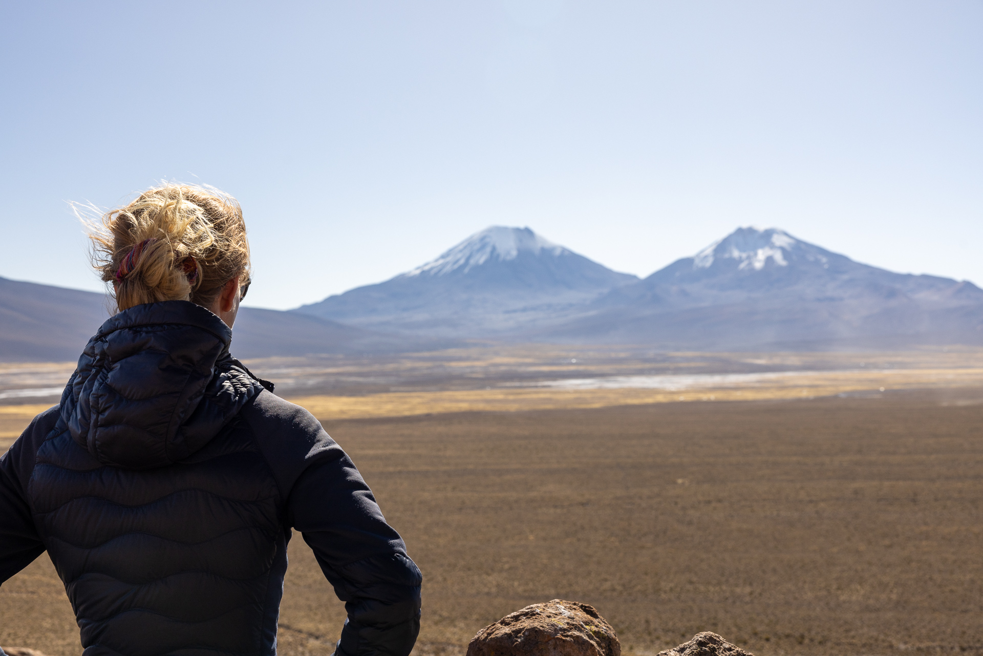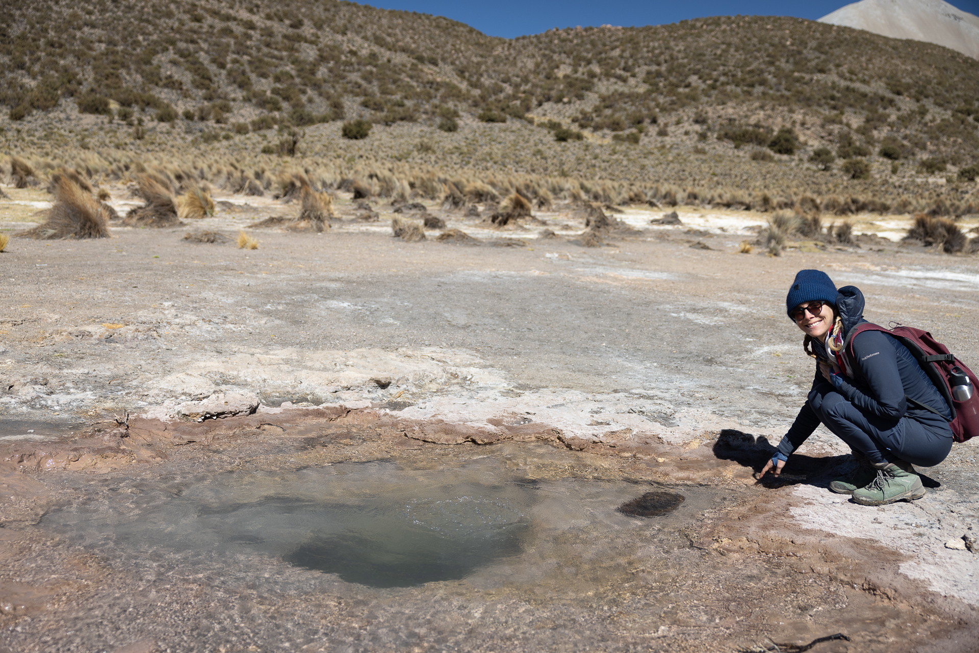 Als wir um acht loslaufen, schlägt uns ein bissiger Wind entgegen. Wir frieren und das obwohl wir Mütze und warme Kleidung tragen. Der Wind peitscht uns regelrecht um die Ohren. Wir befinden uns wieder einmal auf über 3000 Meter und das Klima zeigt uns dies erbarmungslos. Aufgeben ist aber keine Option. Trotz den widrigen Umständen stapfen wir bestimmt dem über 20 Kilometer langen Weg entlang. Zum Glück geht es teilweise fast senkrecht bergauf. Das wärmt innerlich. Nach etwas mehr als einer Stunde erreichen wir die auf fast 4000 Metern gelegene Lagune, welche auch die Grenze zu Chile bildet. Der Wind hat nicht nachgelassen und wir kommen nur langsam voran. Wir schiessen einige Bilder und beschliessen noch zur zweiten Lagune zu laufen, die komplett auf chilenischem Boden liegt. Belohnt werden wir mit einer magischen Aussicht auf die Lagune und weitere Vulkane. Nach mehr als drei Stunden in diesem eisigen Wind geben wir auf und treten den Rückweg an. Trotz wunderschöner Umgebung zehrt dieses Wetter an unseren Nerven und wir sind froh, als wir nach sechs Stunden wandern endlich Beat aus der Ferne sehen. Zum Glück geht es morgen zu den Thermalquellen.