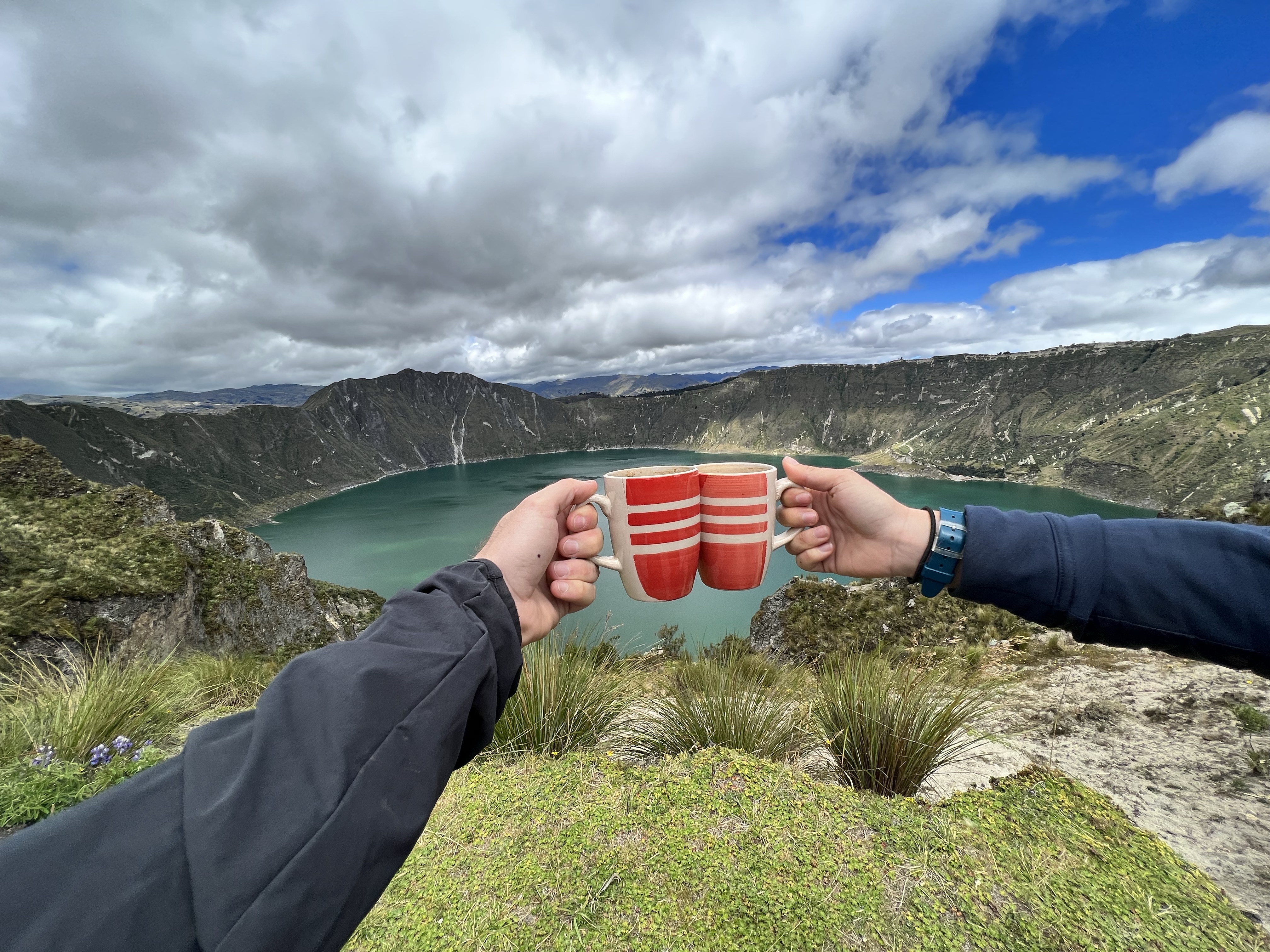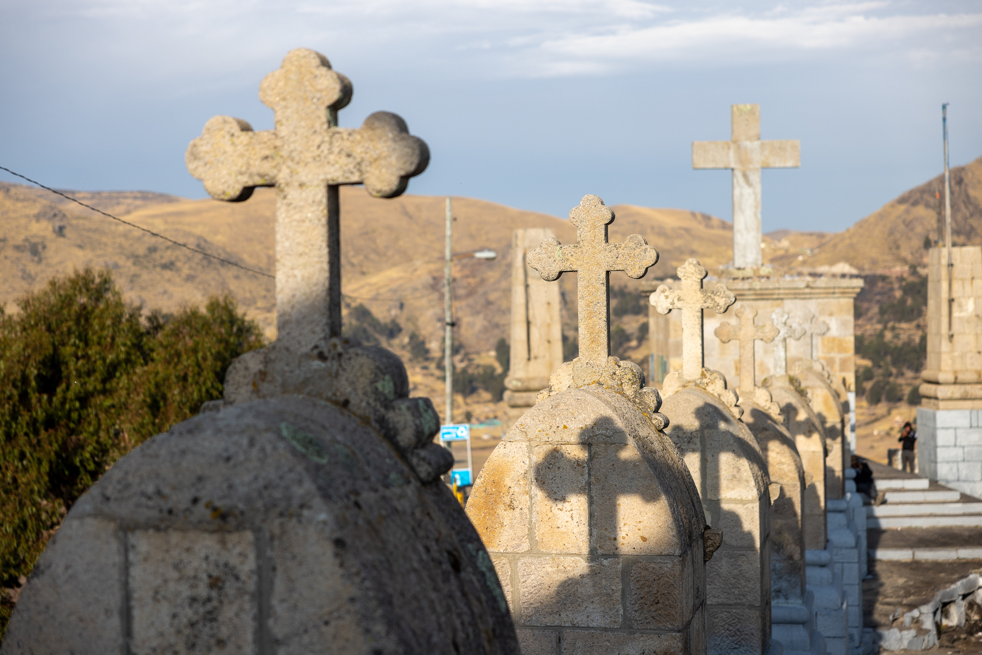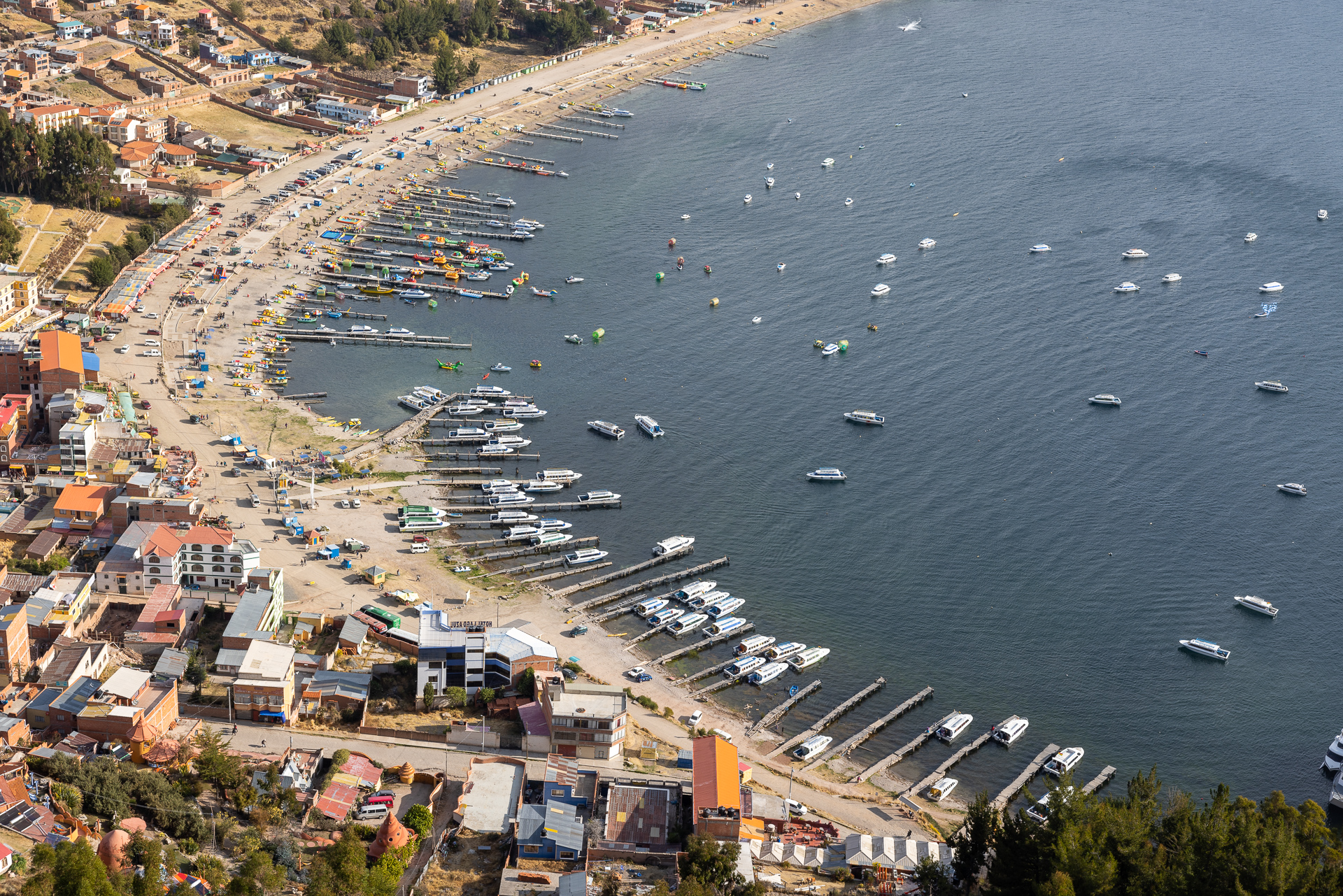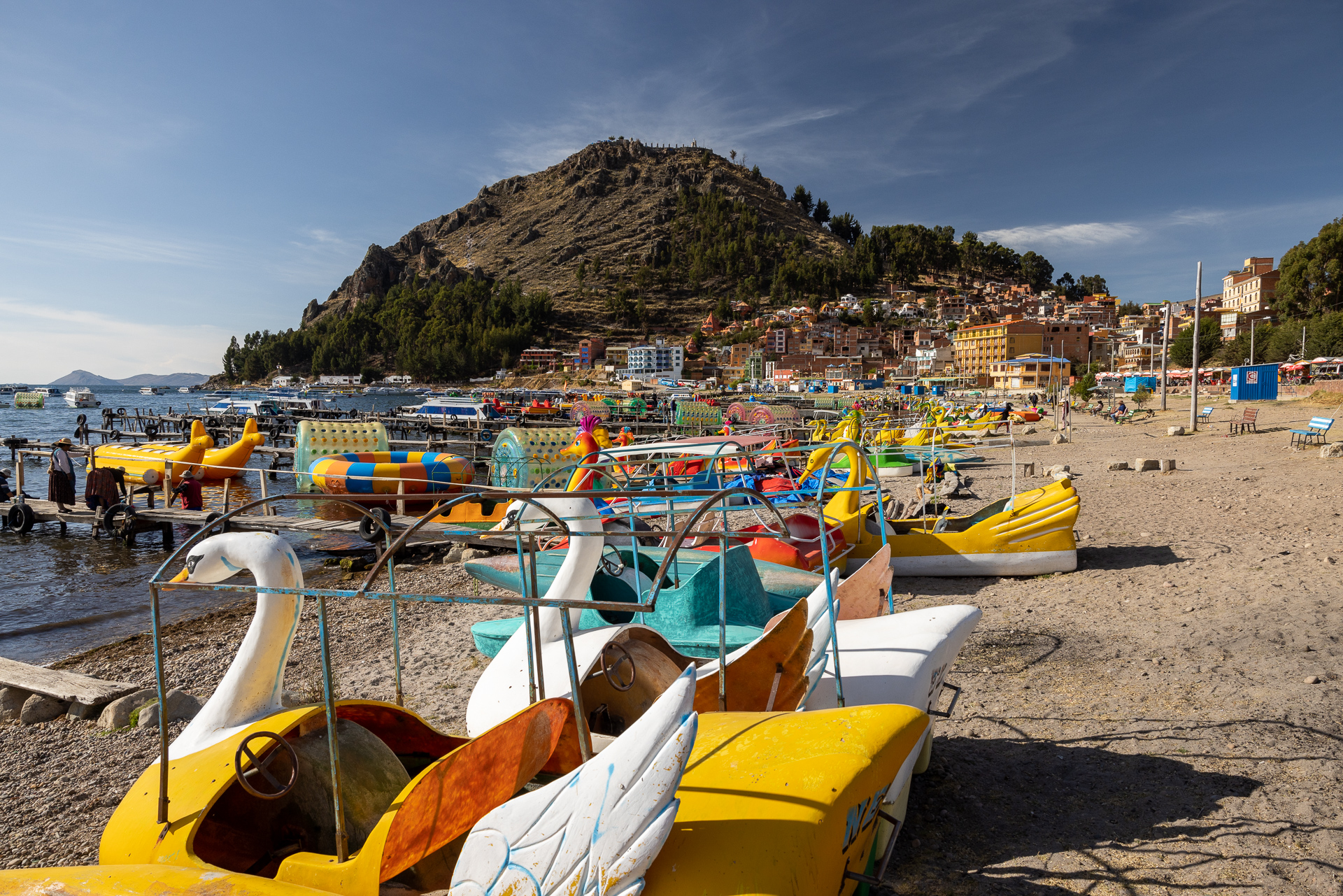 Die Grenze am Titicaca See ist klein und unscheinbar. Innerhalb von circa 45 Minuten haben wir uns in Peru ausgestempelt und sind in Bolivien eingereist. So gefällt uns das! Weiter geht’s zu einem hübschen Camping direkt am See in Copacabana. Dort wollen wir uns für die nächsten Tage organisieren. Die ersten Schritte in einem neuen Land sind immer die gleichen. Bargeld abheben, Sim-Karte besorgen und ganz grob planen. Es stellt sich heraus, dass Copacabana ein bekannter Pilgerort ist. Entlang der Promenade sind mehr als ein Dutzend Touristenbusse parkiert. Viele Peruaner und Bolivianer kommen hierhin, um sich segnen zu lassen. Zudem kann man auf dem eiskalten See Bananenboot fahren, an der Promenade Fisch Essen und den mit Kreuzen übersäten Pilgerhügel erklimmen. Das mit dem Bananenboot fahren lassen wir bleiben. Die leckere Trucha lassen wir uns aber natürlich nicht entgehen und auch den Hügel mit perfekter Sicht auf die Bucht besteigen wir.