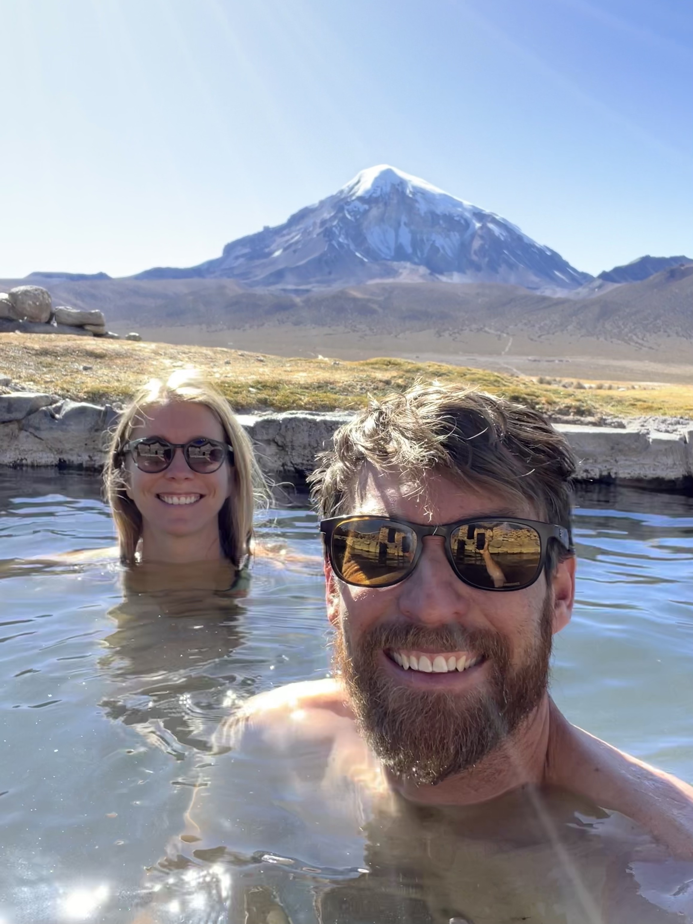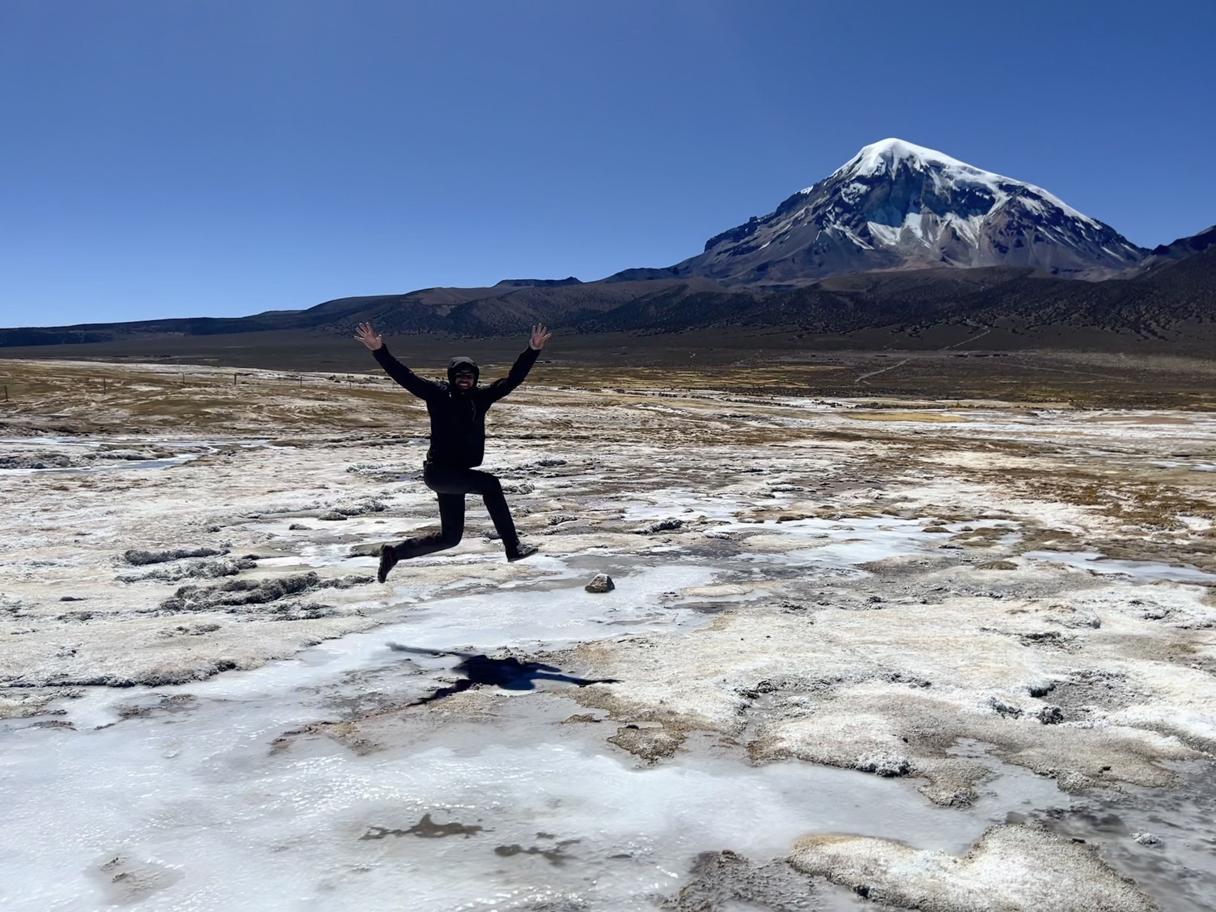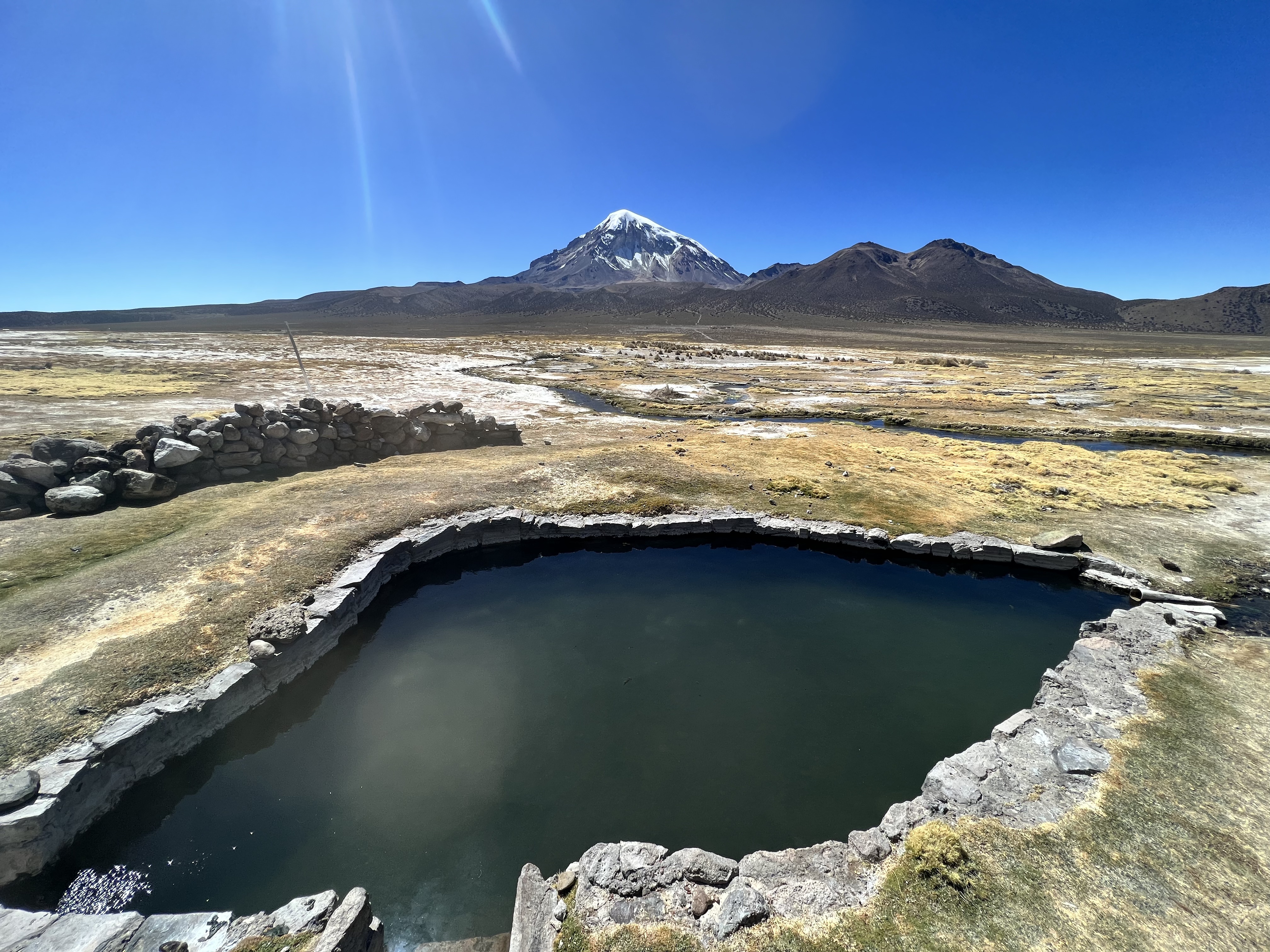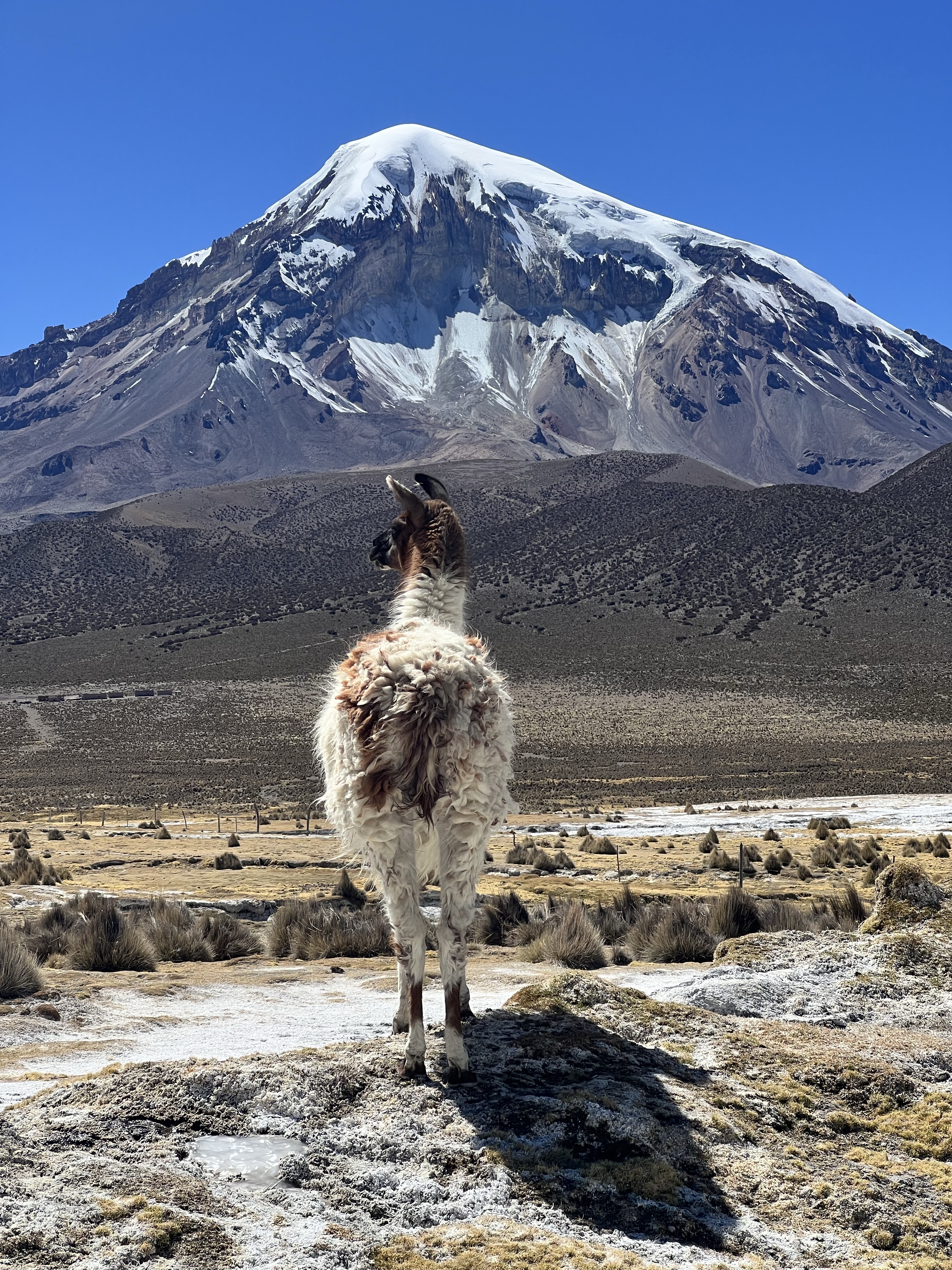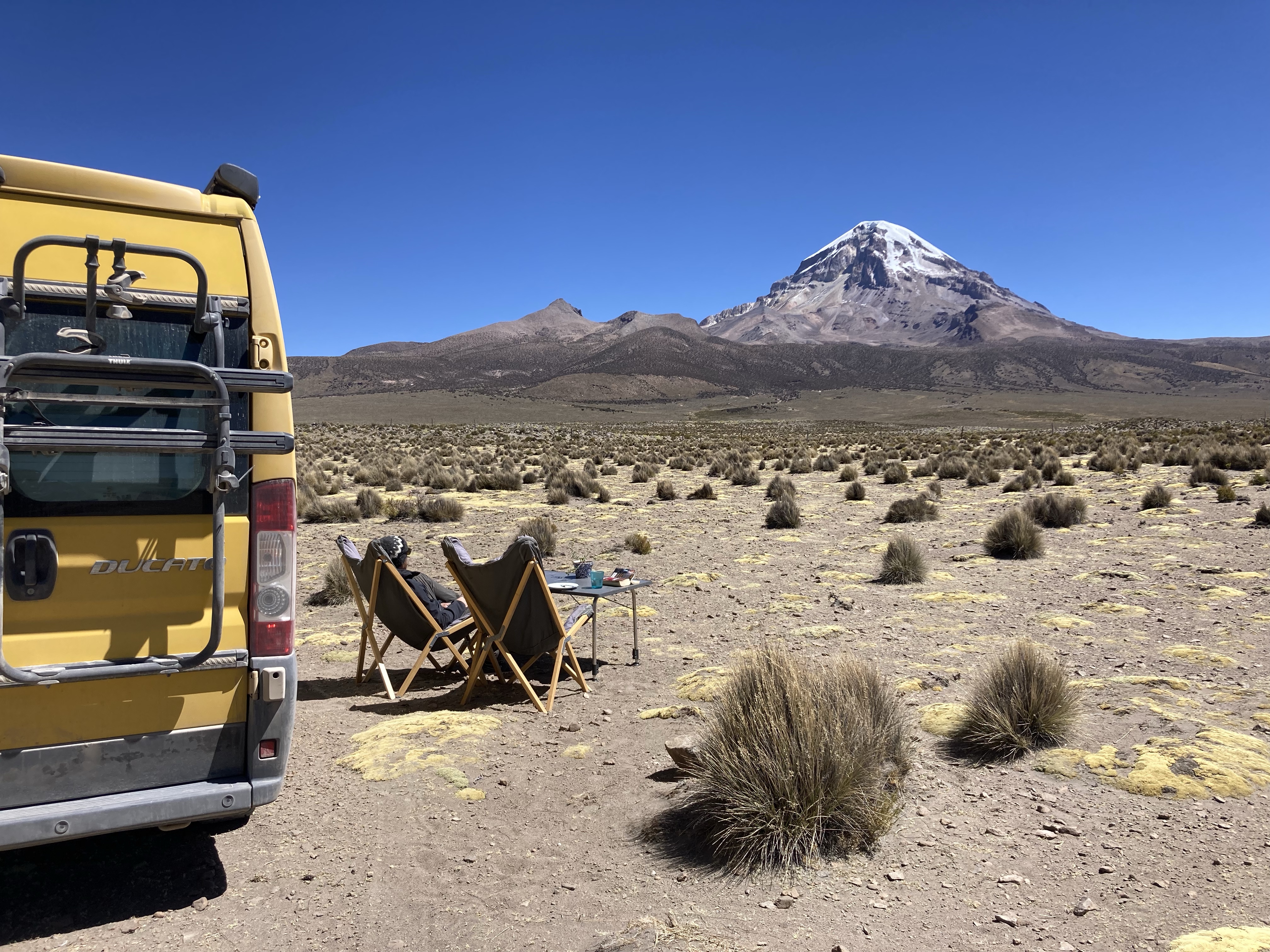 Kaum aufgestanden machen wir uns auf dem schnellsten Weg auf zu den warmen Quellen. Wir suchen uns die heisseste aus und verbringen fast eine Stunde im Wasser mit bester Aussicht auf den 6542 hohen Vulkan Sajama. Besser könnte es nicht sein. Die Flüsschen und kleinen Tümpel um uns herum sind noch gefroren und wir sitzen hier im 40 Grad warmen Wasser. Einfach nur herrlich! Das Thema Duschen ist damit auch abgehakt und so machen wir uns auf den Weg zurück Richtung La Paz. Zuvor schlafen wir aber nochmals im Park auf der anderen Seite des Sajamas. Der höchste Berg Boliviens hat uns komplett in seinen Bann gezogen. Wir parkieren Beat einige Meter entfernt von der offiziellen Strasse und setzen uns an die Sonne. Als wir da so sitzen treibt ein Einheimischer seine Alpaca-Herde über die Felder. Er ist neugierig was wir hier zu suchen haben und kommt mit seinem Fahrrad bei uns vorbei. Wir erzählen ihm, dass wir aus der Schweiz sind und heute hier übernachten. Besorgt weist er uns darauf hin, dass es sehr kalt wird. Er selbst trägt Sandalen ohne Socken und eine Daunenjacke. Eine lustige Kombination. Wir unterhalten uns noch eine Weile und dann radelt er auf seinem uralten Fahrrad zurück ins Dorf. Mittlerweile hat er sich noch eine Mütze aufgesetzt und Wollhandschuhe angezogen. Die nackten Füsse scheinen ihn trotz Minusgraden nicht zu stören. Wir winken zum Abschied und verschanzen uns dann schnell in Beat und kochen etwas Warmes zum Abendessen.