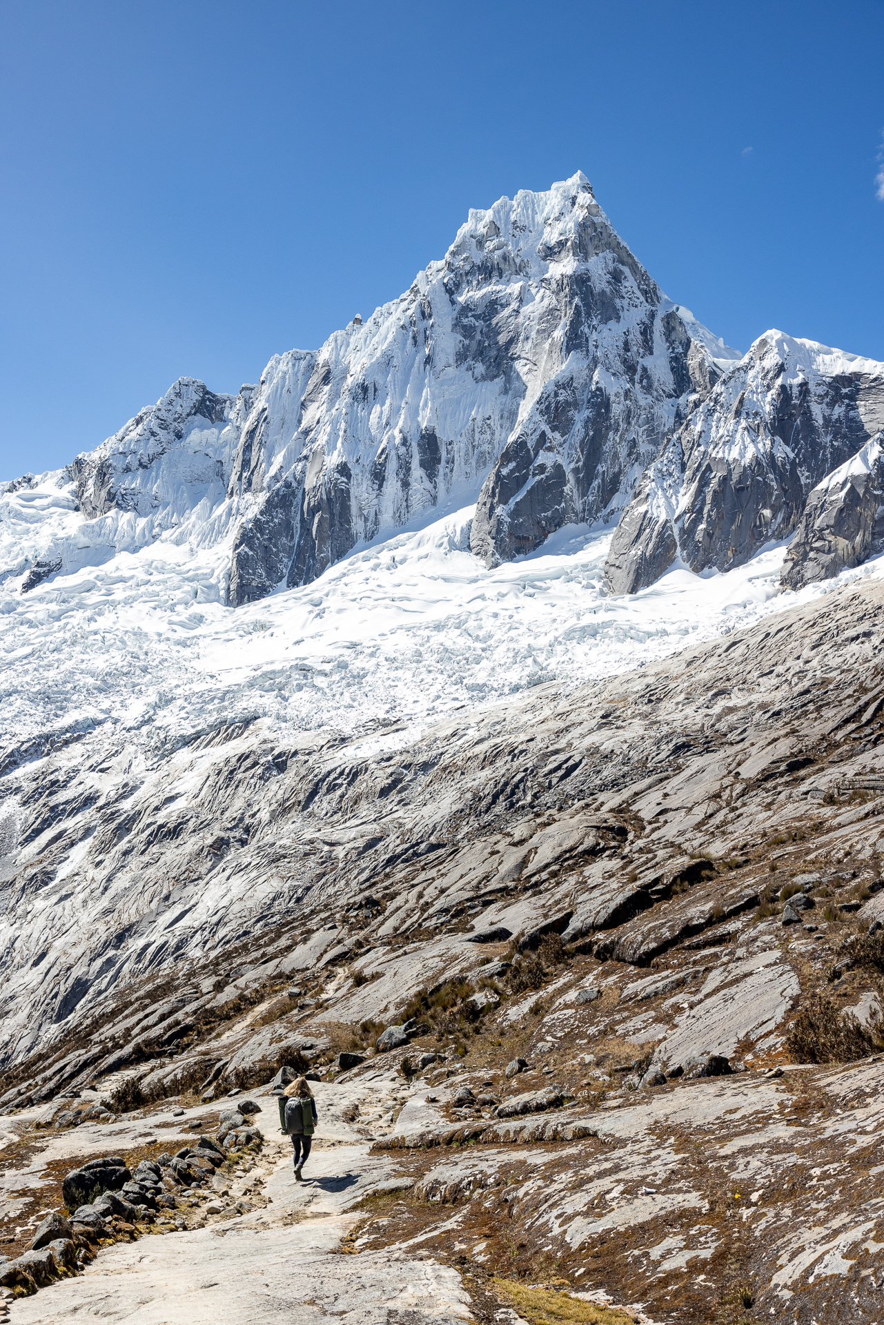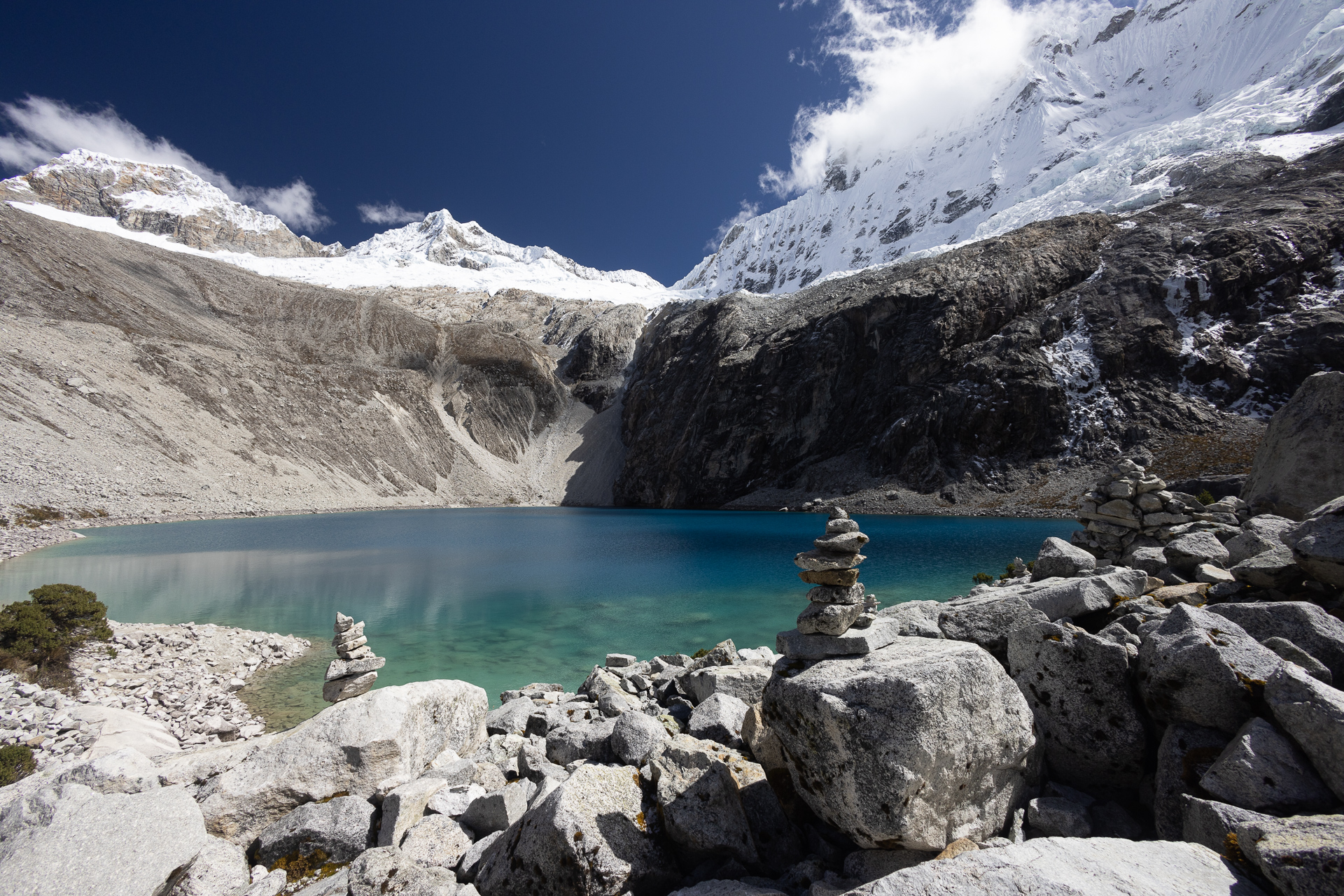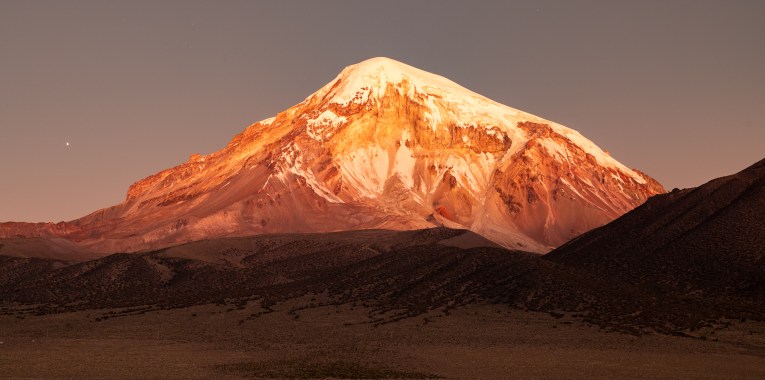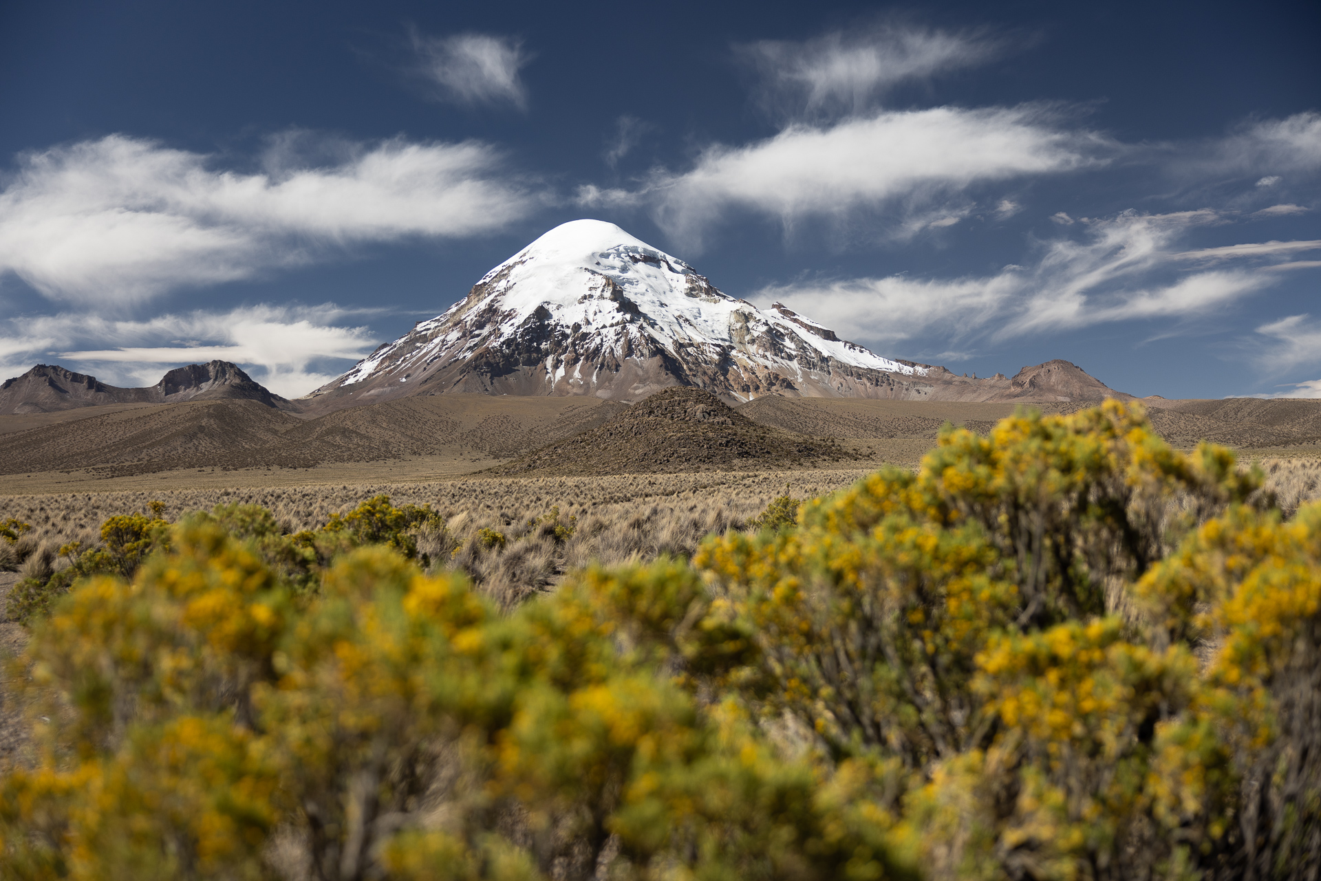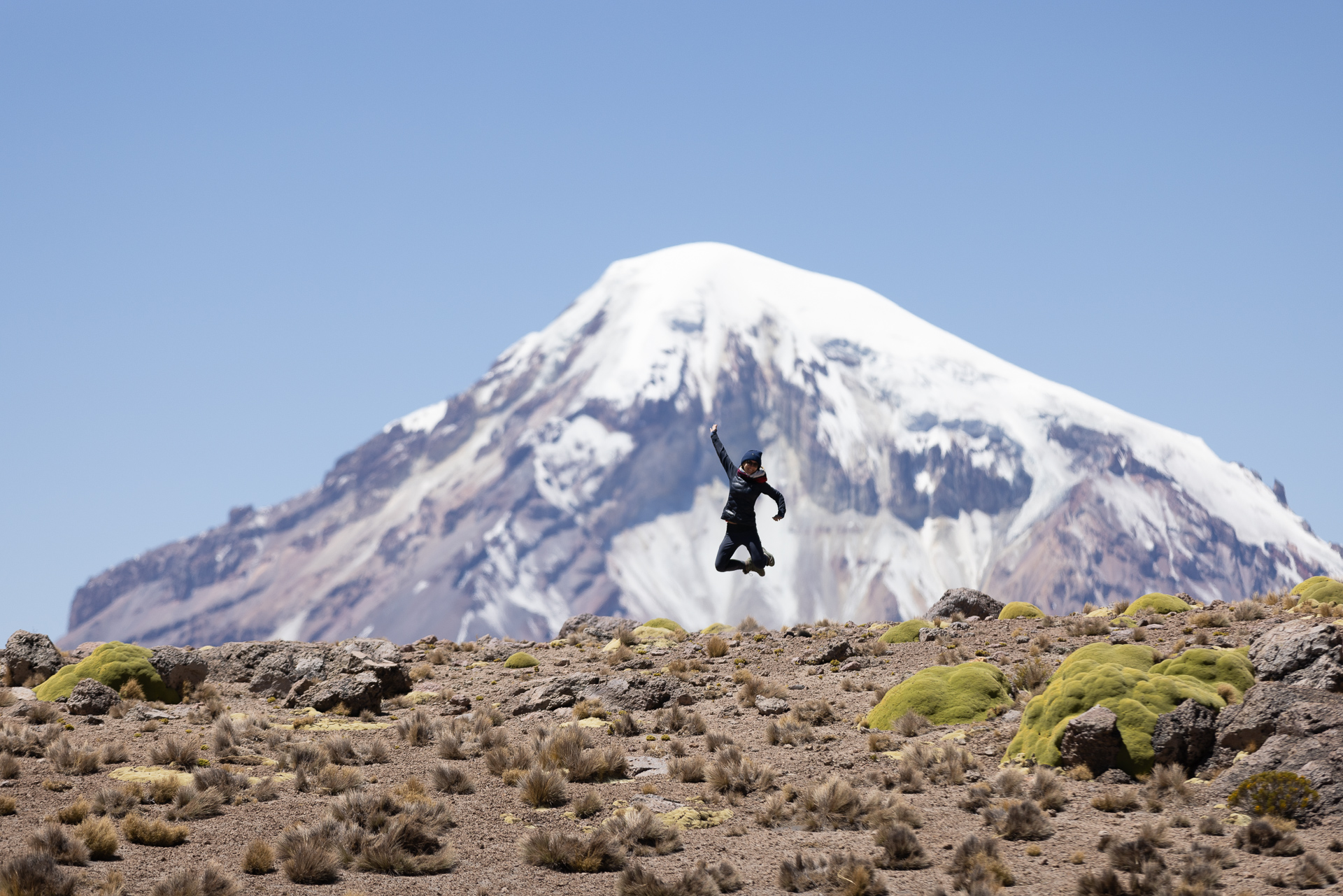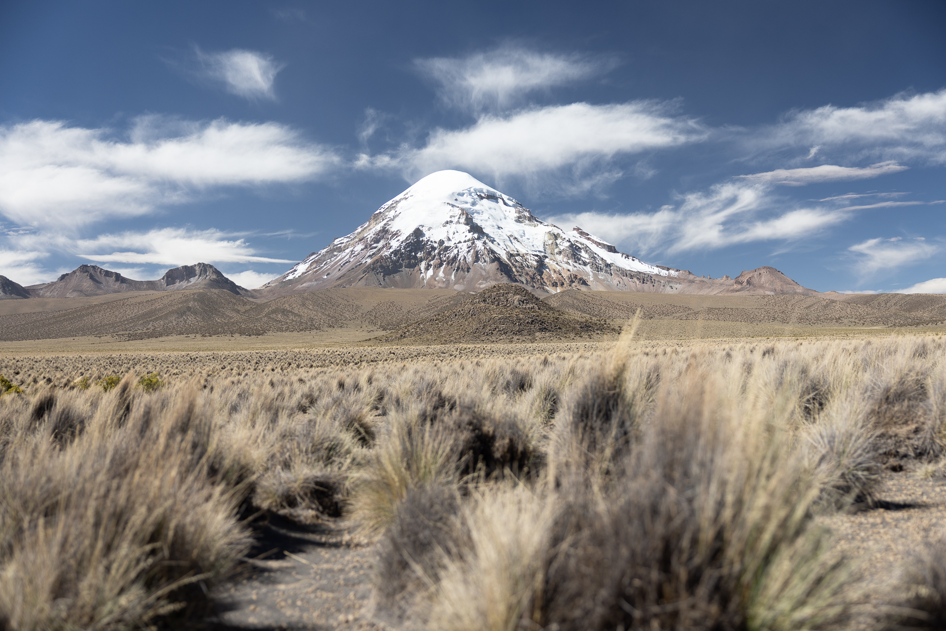 Kaum aufgestanden machen wir uns auf dem schnellsten Weg auf zu den warmen Quellen. Wir suchen uns die heisseste aus und verbringen fast eine Stunde im Wasser mit bester Aussicht auf den 6542 hohen Vulkan Sajama. Besser könnte es nicht sein. Die Flüsschen und kleinen Tümpel um uns herum sind noch gefroren und wir sitzen hier im 40 Grad warmen Wasser. Einfach nur herrlich! Das Thema Duschen ist damit auch abgehakt und so machen wir uns auf den Weg zurück Richtung La Paz. Zuvor schlafen wir aber nochmals im Park auf der anderen Seite des Sajamas. Der höchste Berg Boliviens hat uns komplett in seinen Bann gezogen. Wir parkieren Beat einige Meter entfernt von der offiziellen Strasse und setzen uns an die Sonne. Als wir da so sitzen treibt ein Einheimischer seine Alpaca-Herde über die Felder. Er ist neugierig was wir hier zu suchen haben und kommt mit seinem Fahrrad bei uns vorbei. Wir erzählen ihm, dass wir aus der Schweiz sind und heute hier übernachten. Besorgt weist er uns darauf hin, dass es sehr kalt wird. Er selbst trägt Sandalen ohne Socken und eine Daunenjacke. Eine lustige Kombination. Wir unterhalten uns noch eine Weile und dann radelt er auf seinem uralten Fahrrad zurück ins Dorf. Mittlerweile hat er sich noch eine Mütze aufgesetzt und Wollhandschuhe angezogen. Die nackten Füsse scheinen ihn trotz Minusgraden nicht zu stören. Wir winken zum Abschied und verschanzen uns dann schnell in Beat und kochen etwas Warmes zum Abendessen.
