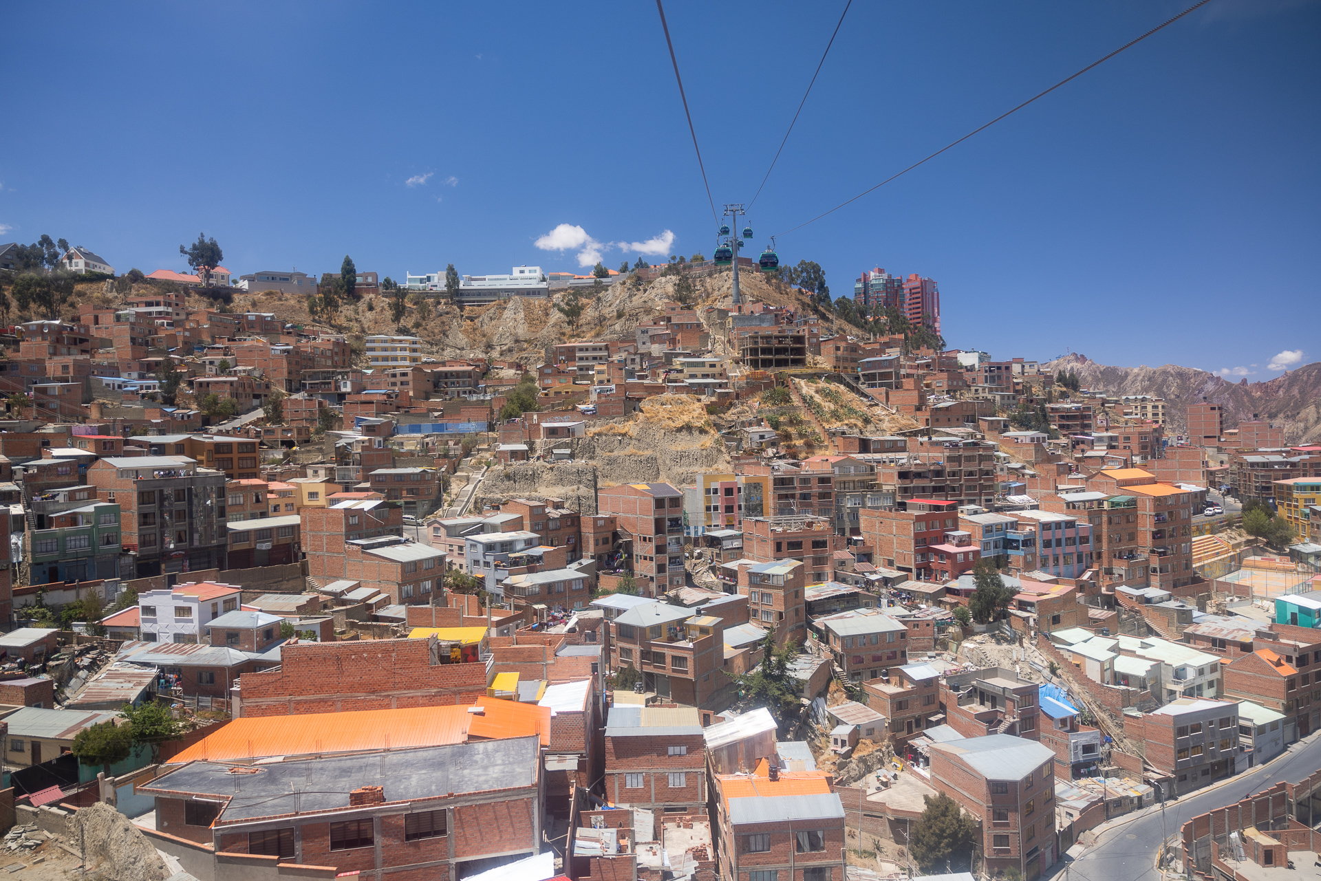 Nach drei Tagen fernab von jeglicher Zivilisation erreichen wir die Metropole La Paz. Zusammen mit dem Vorort El Alto beherbergt sie rund 2 Millionen Menschen. Gelegen inmitten eines Sandstein-Canyons. So etwas haben wir noch nie gesehen. Im Kessel wohnen die gutbetuchten Bolivianer, an den Hängen des Canyons die ärmere Bevölkerung. Eine absurde Szenerie. Wir campen auf dem Parkplatz einer Autogarage etwas ausserhalb von La Paz. Von dort aus erreichen wir die Innenstadt in einer Stunde mittels dem modernen Seilbahnnetz. Dieses wurde erst 2014 gebaut und verkürzt das Pendeln deutlich. Zudem ist die Aussicht über die Stadt unglaublich. Im Gegensatz zu Medellín ist es aber hier für die ärmere Bevölkerung zu teuer. Sie verbringen nach wie vor Stunden im Stau in den günstigeren Colectivos. Schade!